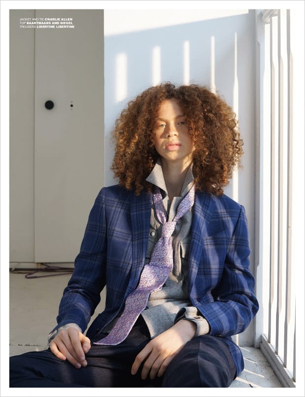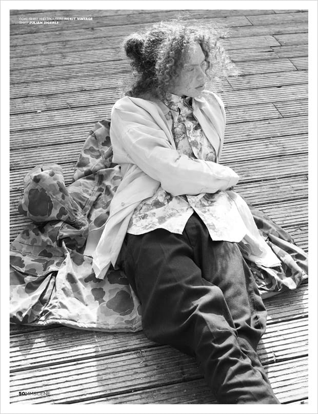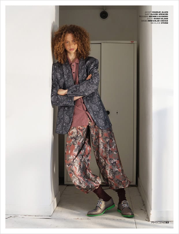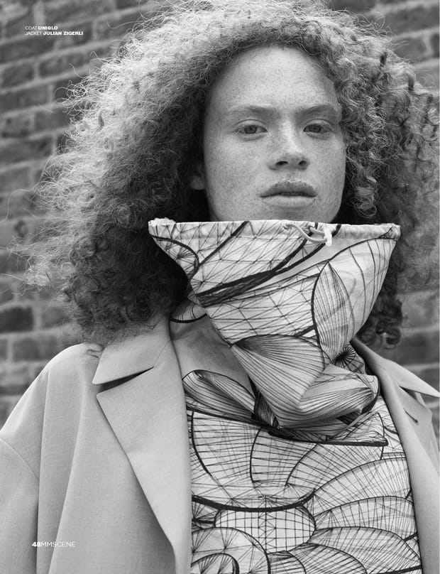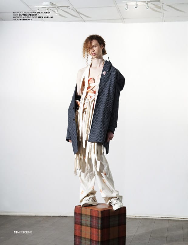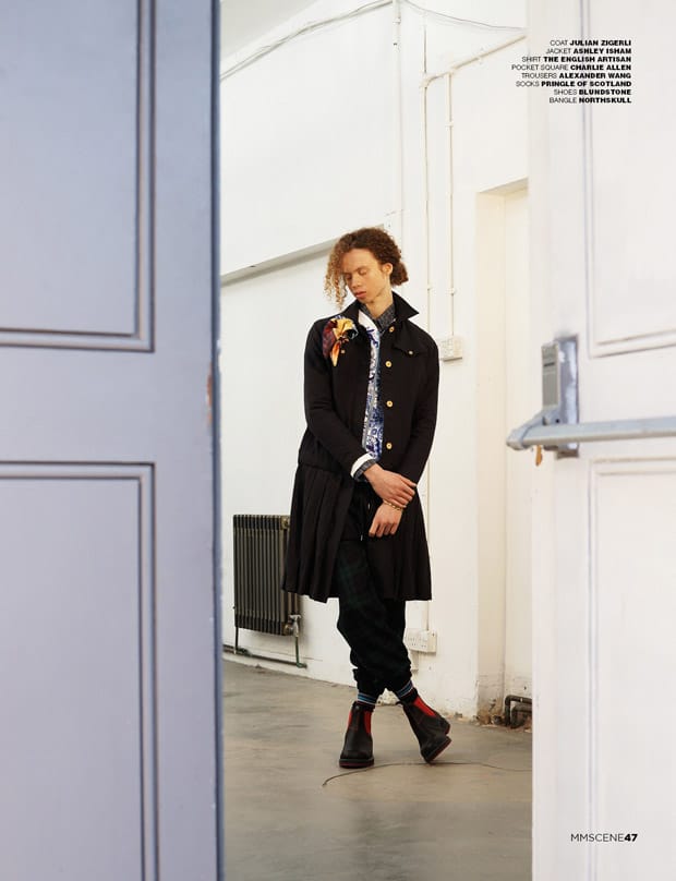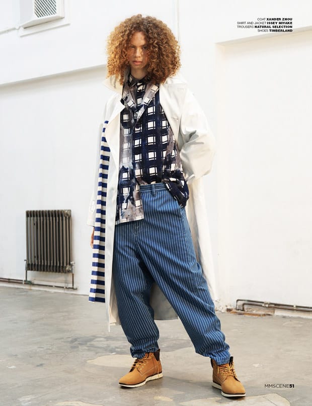 For the session George is wearing selected looks and accessories from Charlie Allen, Baartmaans and Siegel, Libertine Libertine, Julian Zigerli, Ashley Isham, The English Artisan, Alexander Wang, Pringle Of Scotland, Blundstone, Northskull, Rokit Vintage, Uniqlo, Xander Zhou, Issey Miyake, Natural Selection, Timberland, Oliver Spencer, Alex Mullins, Converse, Michiko Koshino, River Island, Irregular Choice, Storm, Ka Wa Key, and Paul & Joe.” – Malemodelscene.net