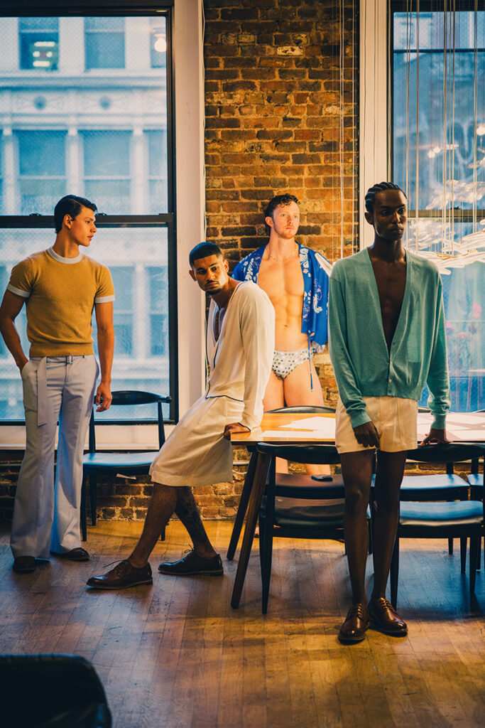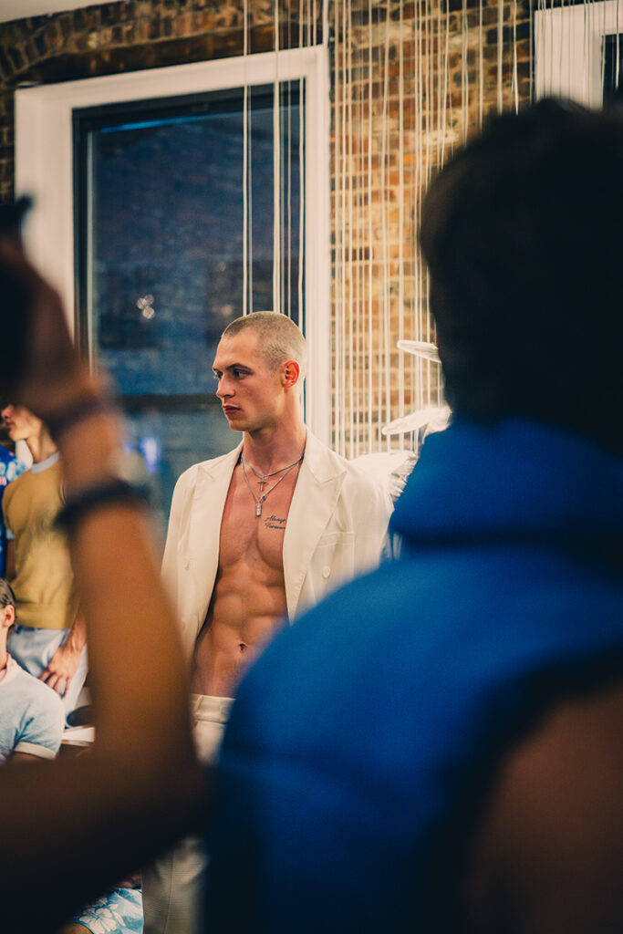 The collection is a bold collision of Wall Street grit and Studio 54 glamour—both a little bit boardroom and a little bit ballroom. Think tailored pinstripe vests paired with sheer mesh tanks, glimmering disco-ready trousers, and accessories that scream power move with a wink.