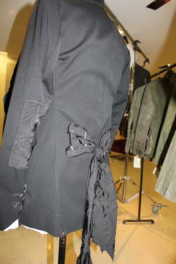 “Military is a huge motif, and Lauren constructed many of the pieces out of vintage duffel bags, some from World War II, so they’re all one-of-a-kind. A canvas tuxedo jacket with a crushed silk lapel that looks almost ruffled and a nipped in waist attracted my attention.” Cheryl seemed to confuse one piece of garment in particular. She innocently mistaken-ed a tux jacket for womenswear when in fact it was the other way around.
