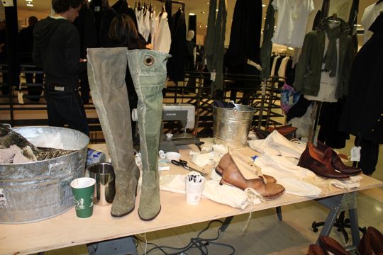 Noteworthy: “He also offers a limited edition run of shoes modeled after a pair of beat up classic English boots for guys and a pair of olive-drab knee high boots for women.”