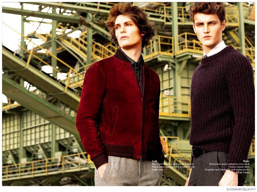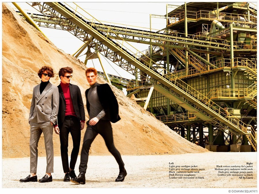 Concrete Fall Fashion-Gucci is all the rage as models James Smith, Gordon Bothe and Kai Keller come together for an advertorial targeted to the Middle East. Photographed by Giovanni Squatriti, the handsome trio are elegant in sharp tailored ensembles that achieve success with the fine details such as quality buttons, luxurious fabrics and impeccable fits. / Styling by Gioele Panedda. Courtesy of – thefashionisto.com