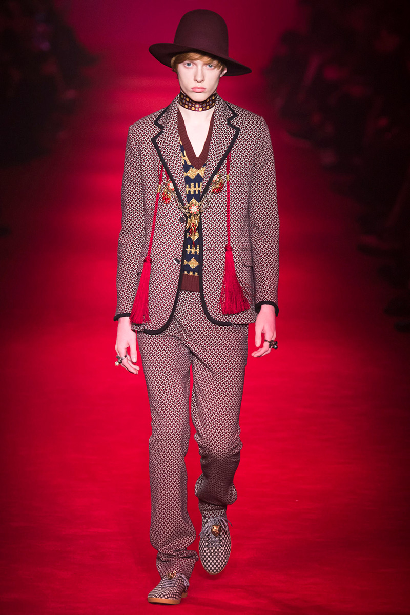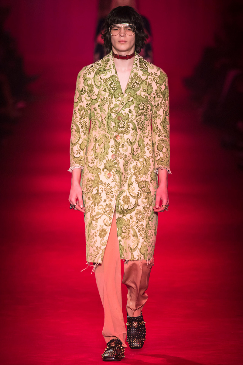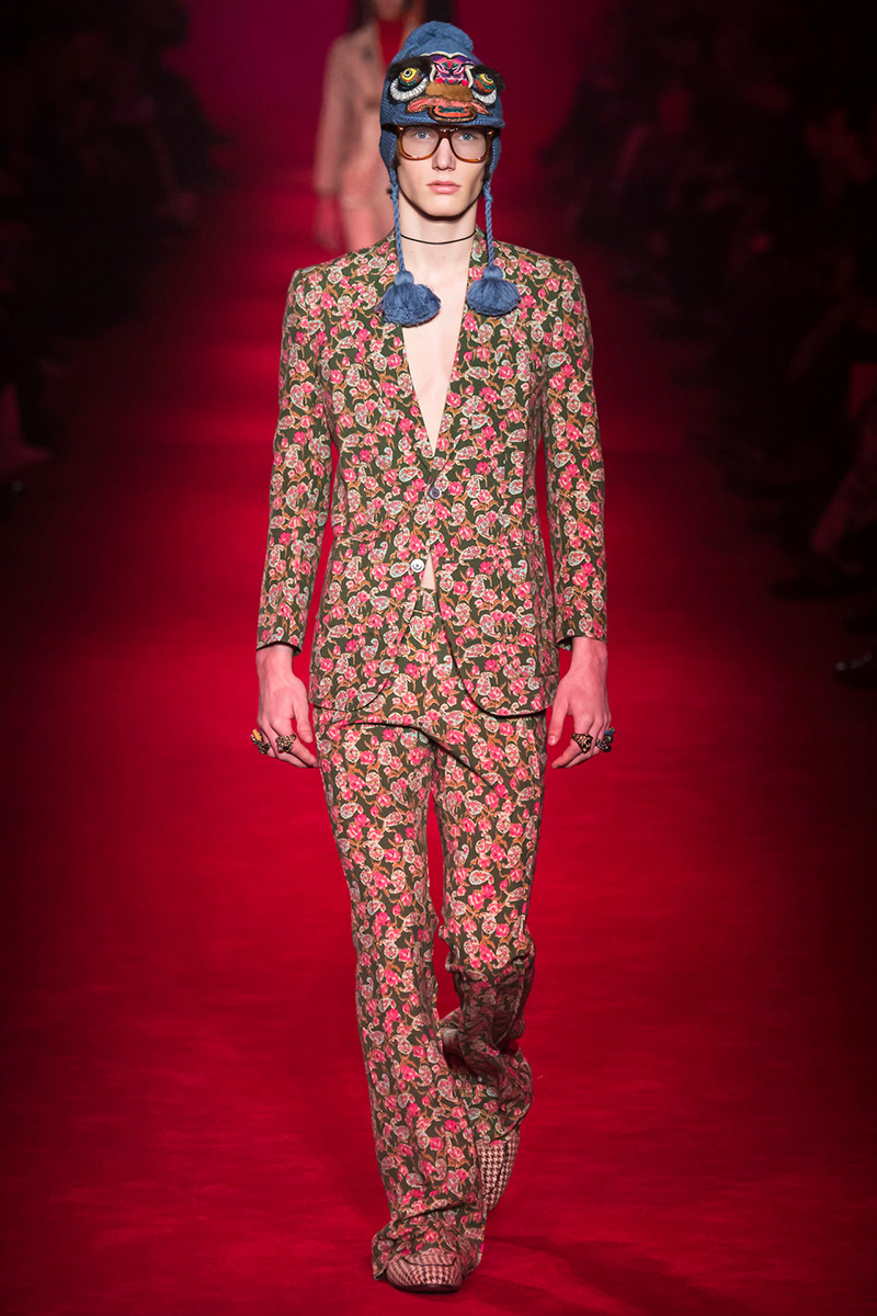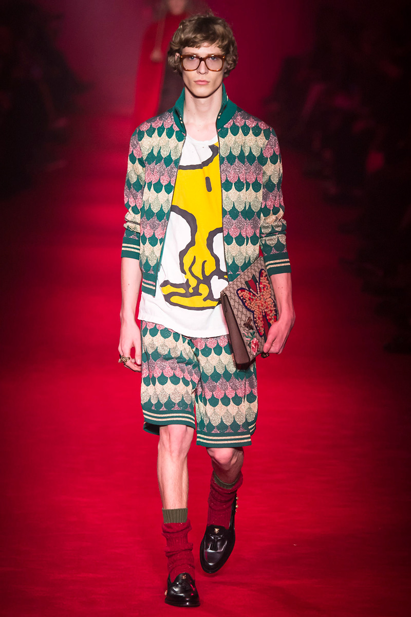 Embroideries and old-fashioned patterns are a constant with Michele as well as mix and match. Look at the 70’s three-dimensional yellow-blue pattern outfit with floral embroidery and striped top with Schultz’ Snoopy or the cardi with furry collar and teddy bears. The kangaroo fur-lining loafers- people around the world are freak out over them!- are the hot stuff along with super studded lace-ups and rubber-soled trainers. Jazzy wool hats remind me of qurpu– Peruvian Highlands traditional hats- while Holmes’ deerstalkers have an unconventional style with some pom poms. With this collection Alessandro Michele’s been able- with his incredible edge- to turn the old dust into brilliant polish.” – FY Magazine.es