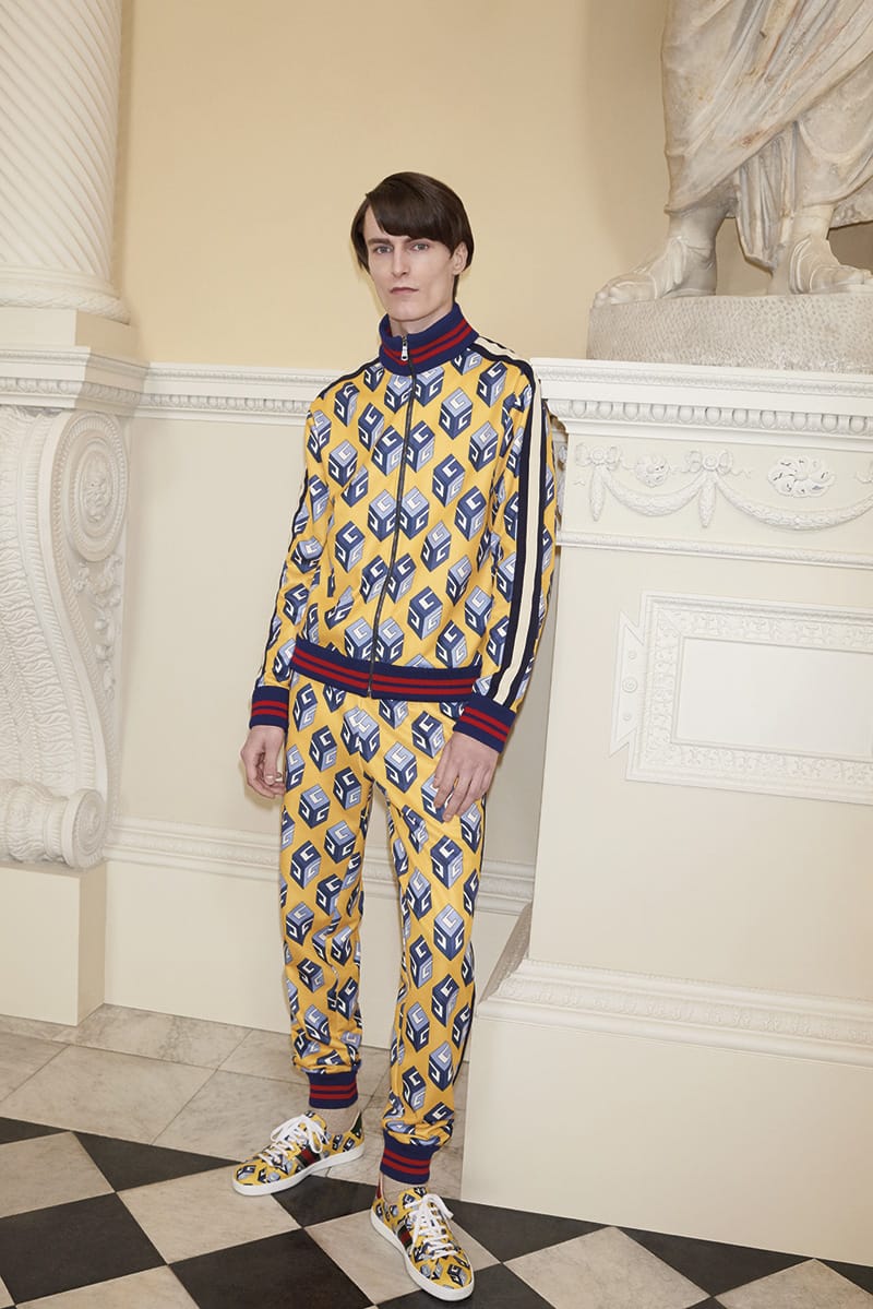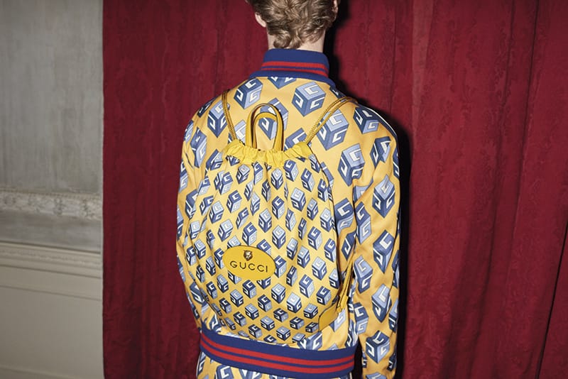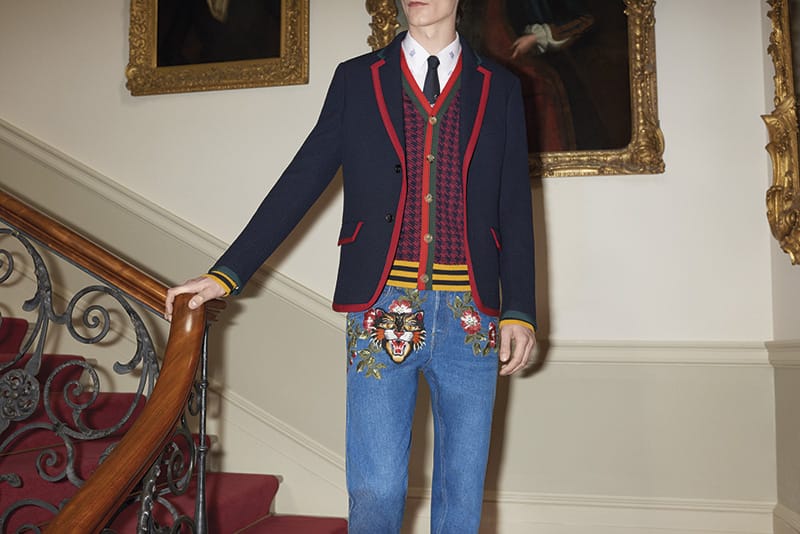 The rest of the collection features blue-washed five pocket jeans, prep school-inspired tailored jackets and trousers along with two formal suits, technical sportswear, and small accessories including leather bracelets, cufflinks, ties, watches and scarves. A yellow Gucci label will feature across each ready to wear piece, unique to this exclusive capsule collection.