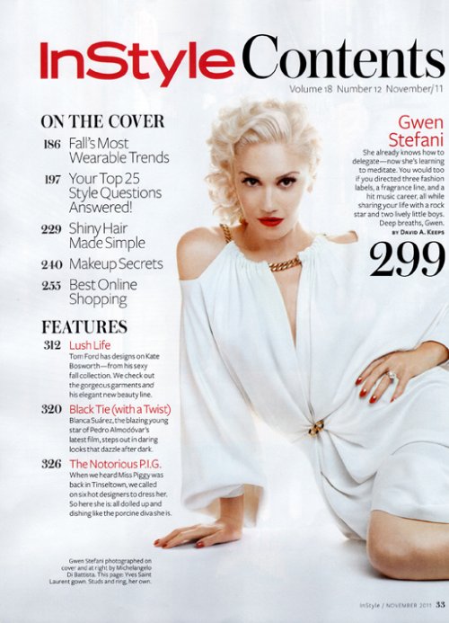 Pop/Rocker Icon Gwen Stefani, channels a modern day Marilyn Monroe-esque look, strutting a Pink Satin dress with her signature platinum blonde hair as the latest cover girl for InStyle mag’s November issue. We miss No Doubt and hope that their long delayed 5th album will finally see the light of day come early 2012!