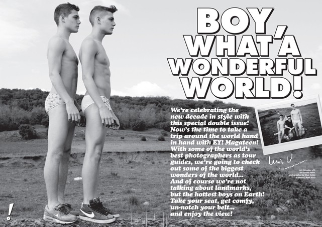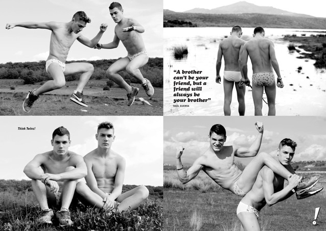The current sixth issue of Electric Youth! Magateen features Spanish twins Haydem & Raul Guerra by Chus Anton. On the left we have Haydem, who doesn’t smoke, doesn’t drink, doesn’t masturbate and has never stolen anything. On the right we have Raúl, who lost his virginity at 13! – Courtesy of homotography.blogspot.com