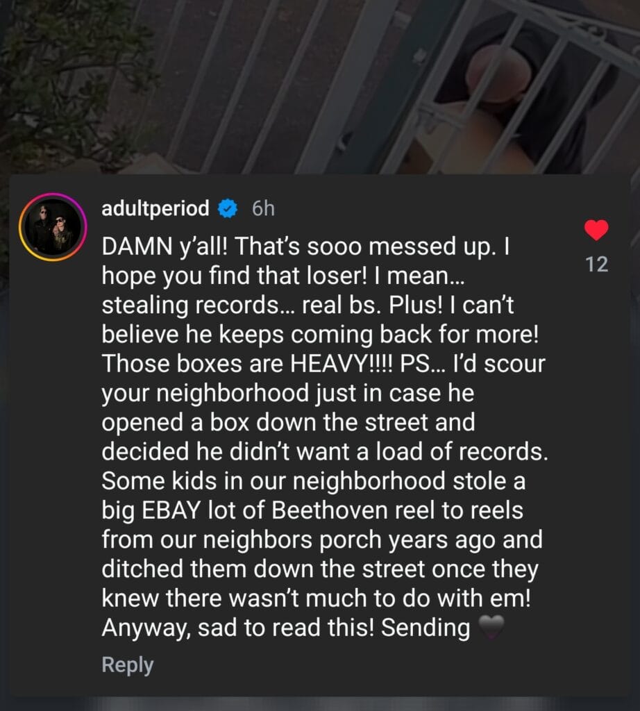 Fellow band ADULT. offered condolences and recommendations on possibly locating stolen vinyl via a IG comment.