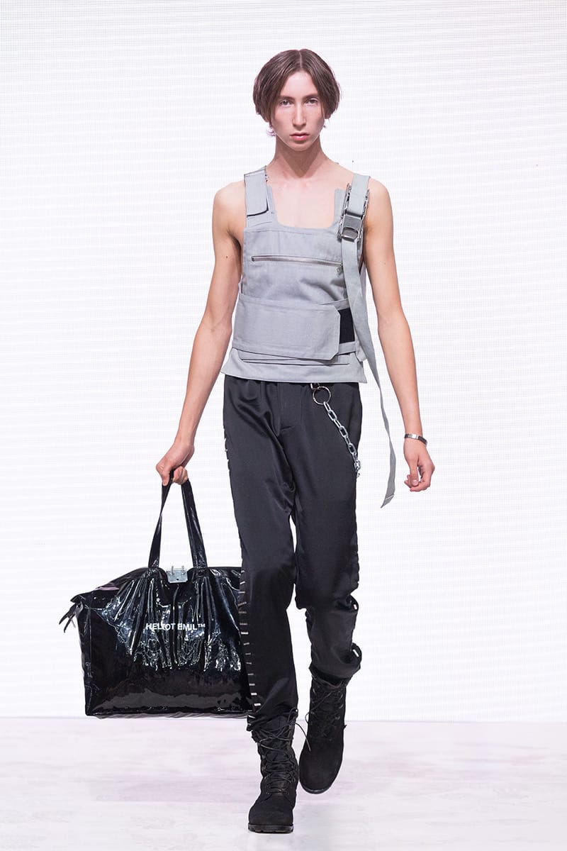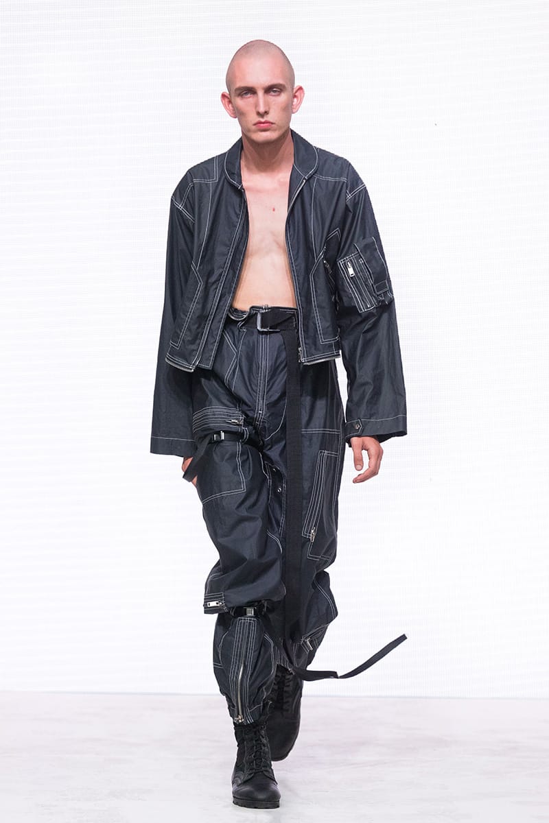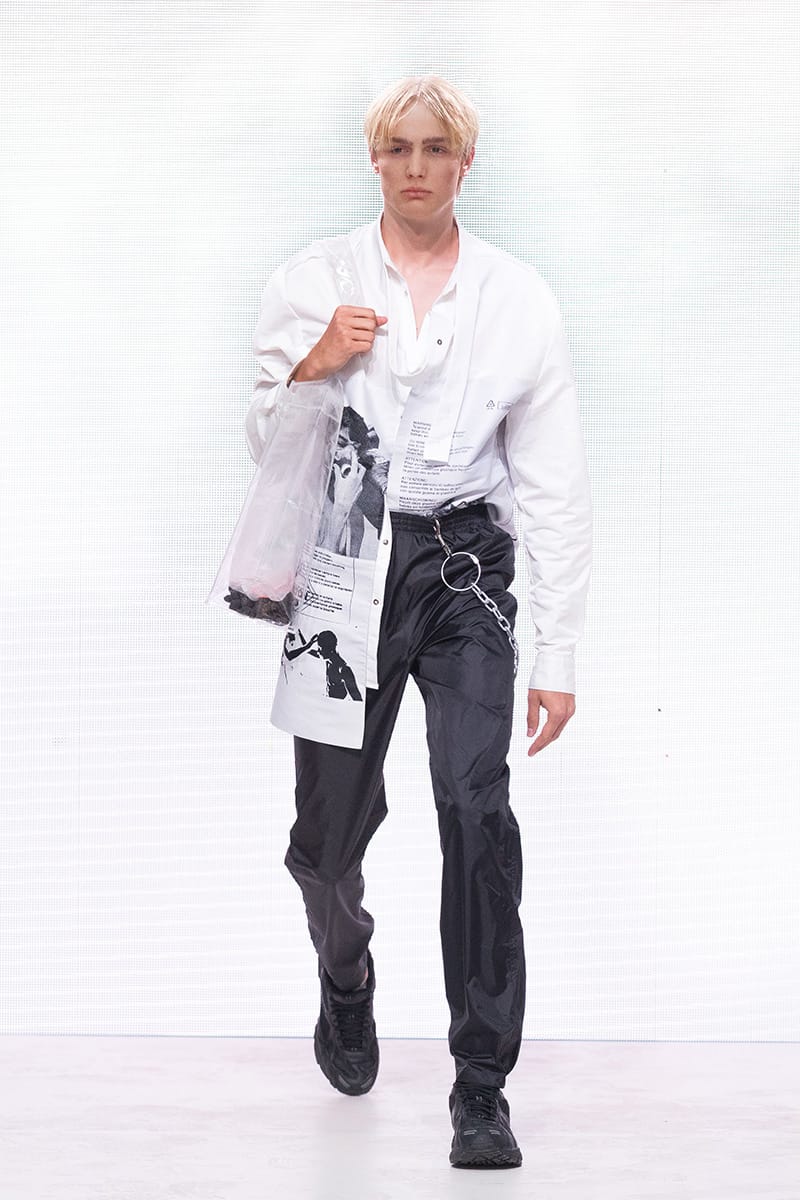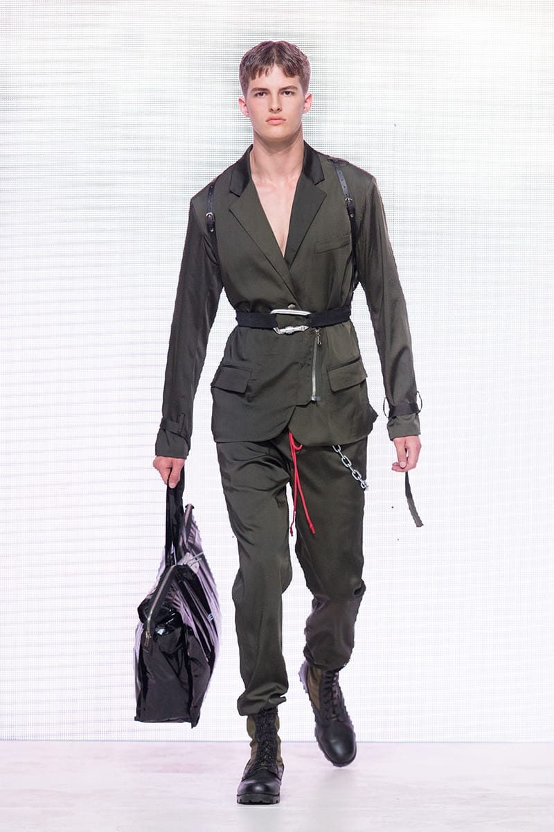 “Heliot Emil Spring/Summer 2018 collection is titled “P .T .C .S.” short for post traumatic combat stress. The collection follows the aesthetic of an individual dealing with a postwar existential crisis, resulting in experimentation with a combination of drugs and parties. Designer Julius Juul mixed the formality and discipline of the military with the carefree attitude of a lost mind. Combining various fabrics and sewing techniques gives this collection a truly unique look.” – FY Magazine.es