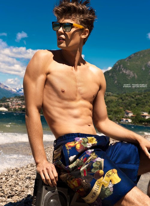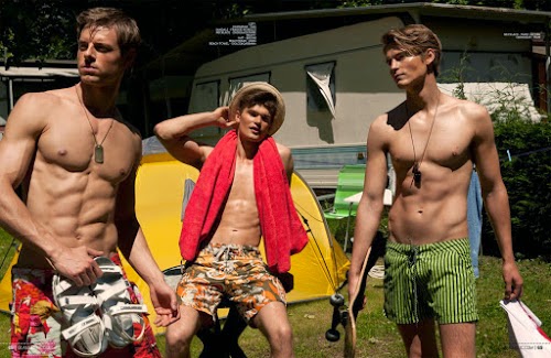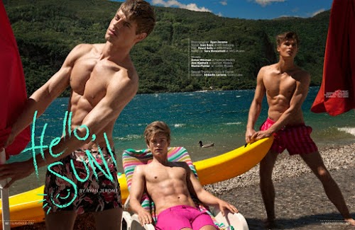 Models Martin Pichler, Anton Wörmann and Jon Hjelholt are photographed by Ryan Jerome and styled by Ivan Rasic in the story ‘Hello, Sun!’ for Glamoholic magazine; with hair by Pawel Solis and makeup by Sara Mencattelli. Courtesy of – Homotography