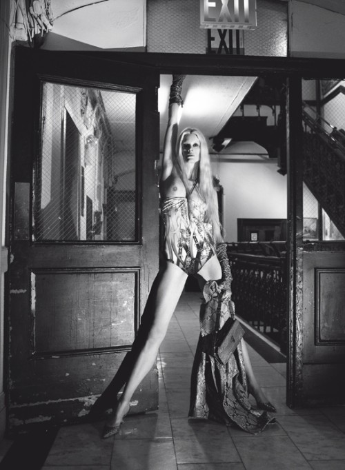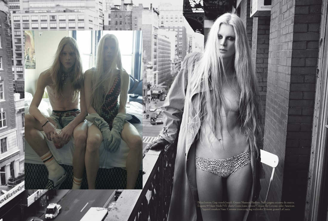 Kristen McMenamy stars in Vogue Italia’s May 2011 cover story by Steven Meisel, Hotel Chelsea. The swimwear editorial also features models Loammi Goetghebeur, Gus Drake, Zach King, Nicola Wincenc and Eugeniy Sauchenka. Courtesy of Homotography