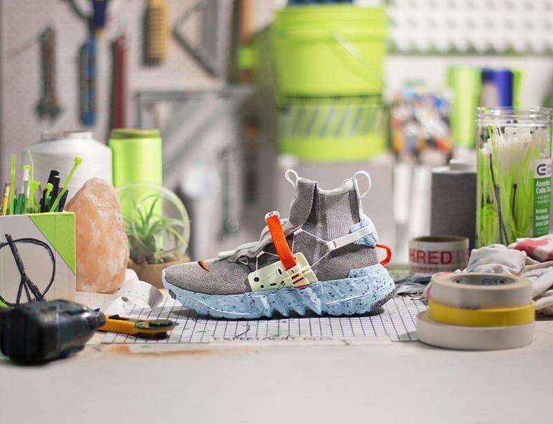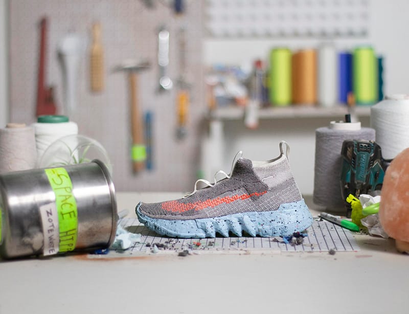 “Space Hippie, Nike’s exploratory footwear collection constructed with “space junk” — transformed factory and post-consumer waste — marries sustainable practices and radical design. Each of the four Space Hippie silhouettes provides a unique aesthetic and fit — including traditional laces and laceless designs. The manufacturing, which employs about 85 to 90 percent recycled polyester Space Waste Yarn, recycled Nike ZoomX foam and Crater Foam (a blend of standard Nike foams and Nike Grind Rubber), results in a radical design with a low carbon footprint.