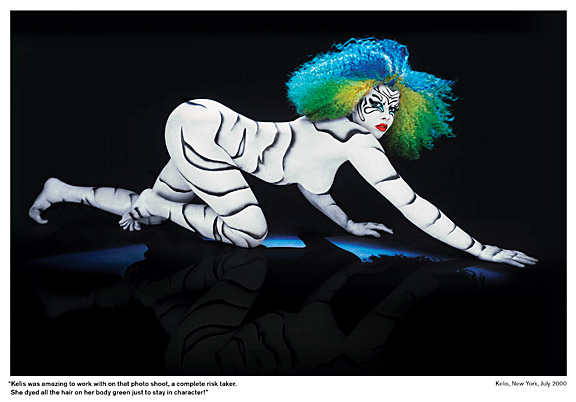 Kelis is completely transformed for this shot with zebra-inspired full-body paint with aqua lids and a scarlet pout. Her hair is equally wild, with streaks and patches of blue, yellow, and green. Hype even reveals that Kelis “dyed all the hair on her body green just to stay in character!” #dedication