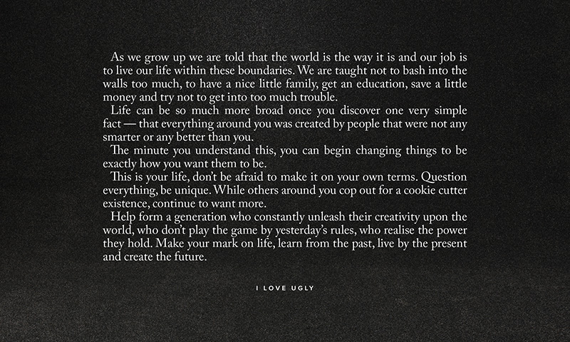 All models are dressed in past, current and future I Love Ugly garments available in limited numbers in all I Love Ugly flagship stores, online orders and select worldwide stockists next week.I Love Ugly continues to stimulate individuality and inspire creativity with this powerful campaign.” – FY Magazine.es