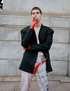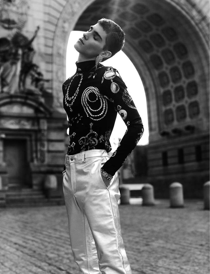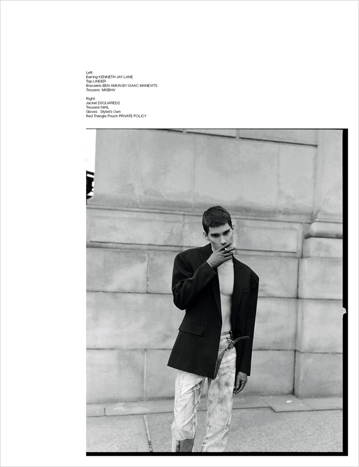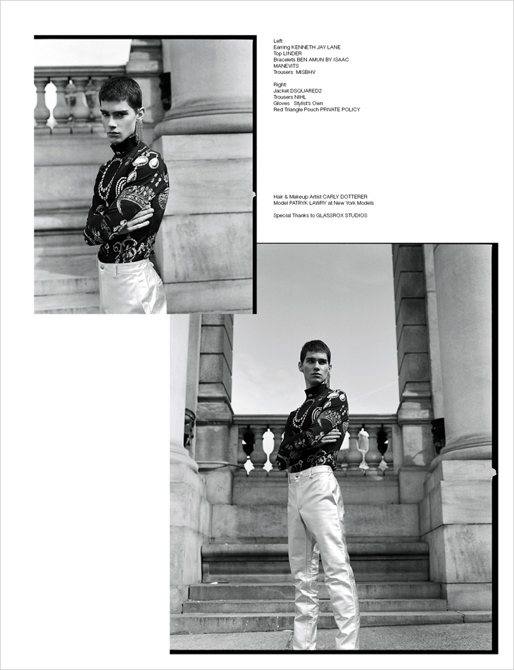 For the session Patryk is wearing selected pieces from NIHL, Private Policy, Ben Amun by Isaac Manevits, Erdem, Dsquared2, N°21, Prabal Gurung, Kenneth Jay Lane, Calvin Klein, Linder, and MISBHV.