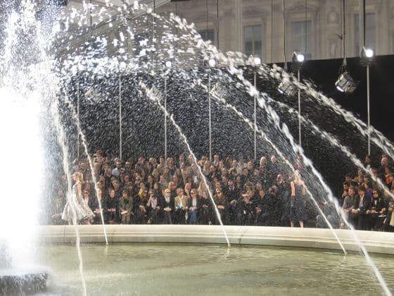 As if Marc’s New York show didn’t leave us feeling romantic enough, he outdid himself in Paris. A tent was built around a fountain in the Louvre’s courtyard; the audience sat in a ring around it. The music began at 2:30 on the dot, like the score to a Fellini movie, and Laetitia Casta walked out, pouring over the edge of her pinstripe corset.