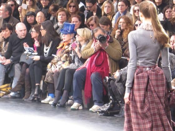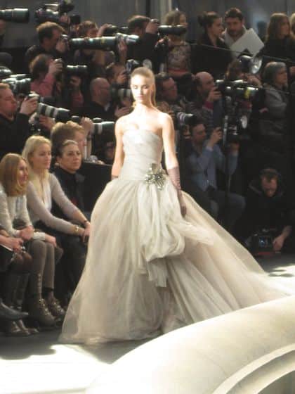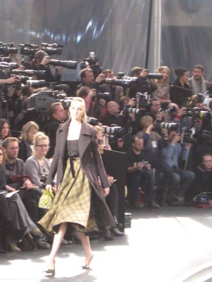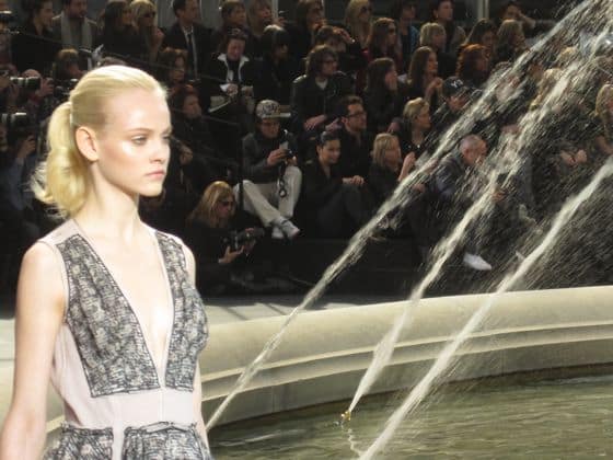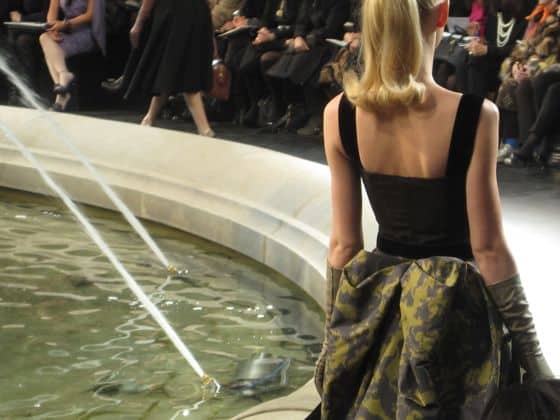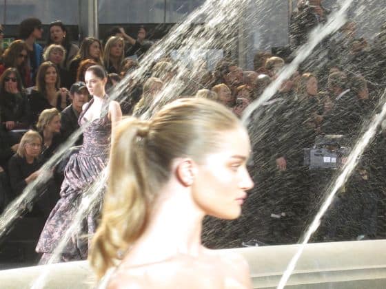 Around the fountain they went: Natasha in a leather corset with crocodile pumps, Kasia in a tweed suit, Anne V in velvet, Lara in a floral organza dress just begging for prom circa 1950, Mariacarla in a leather coat, even Bar Rafaeli in a silk wool dress—all with pulled pack ponytails and lady-like bags.