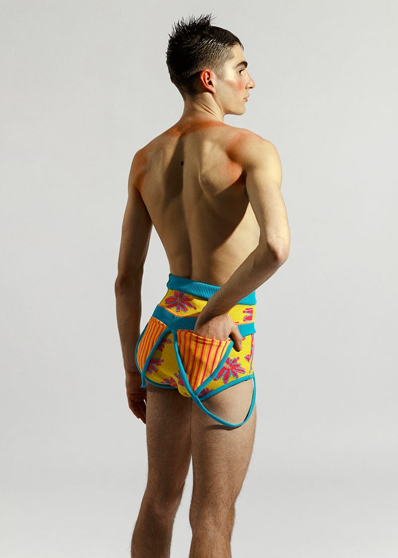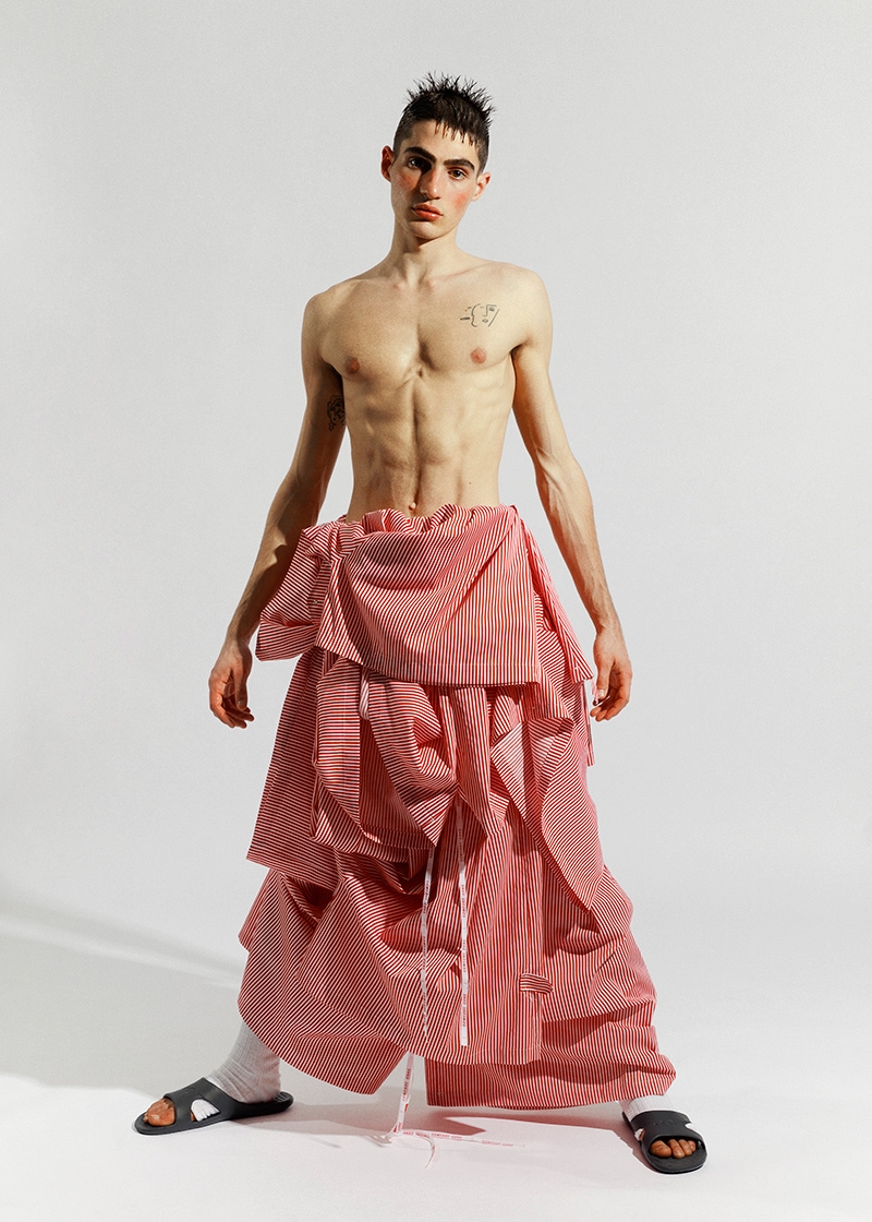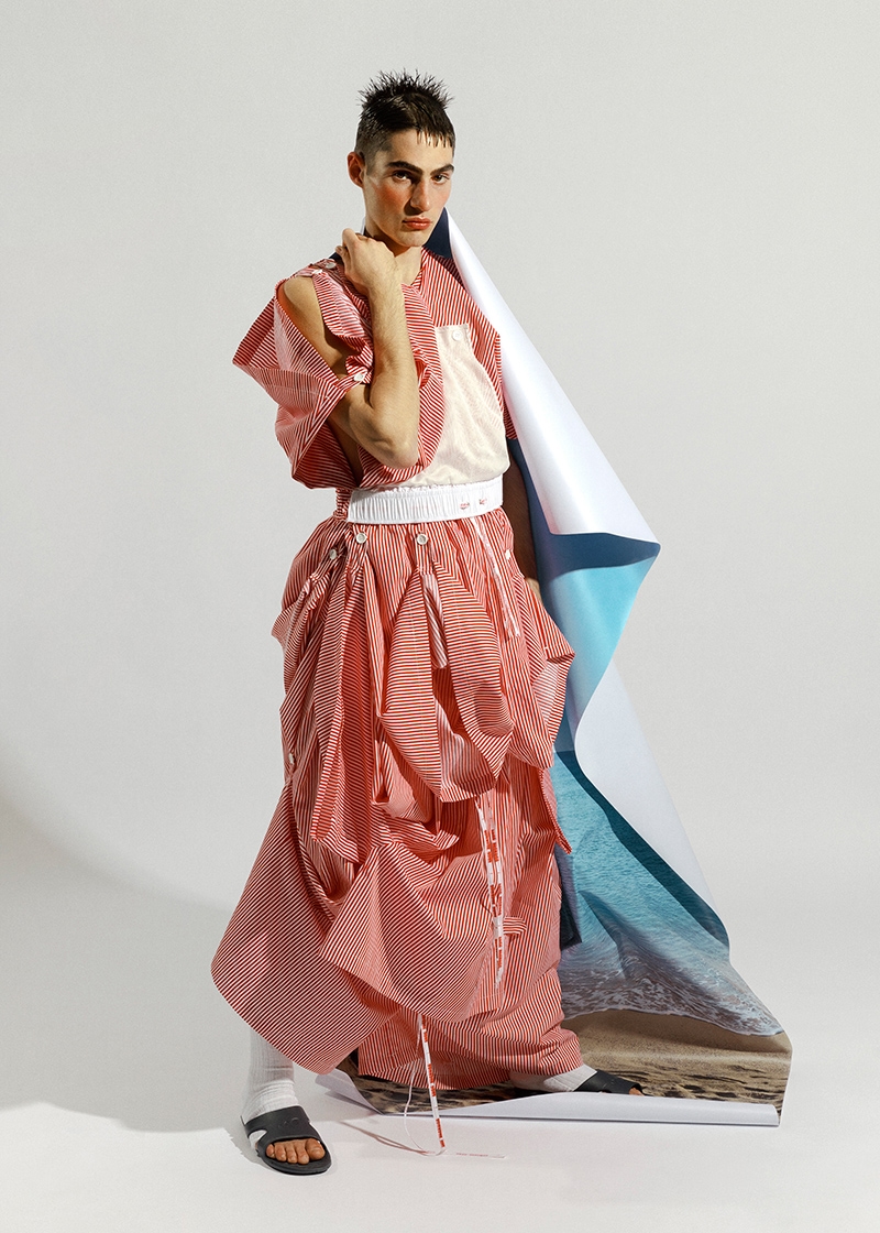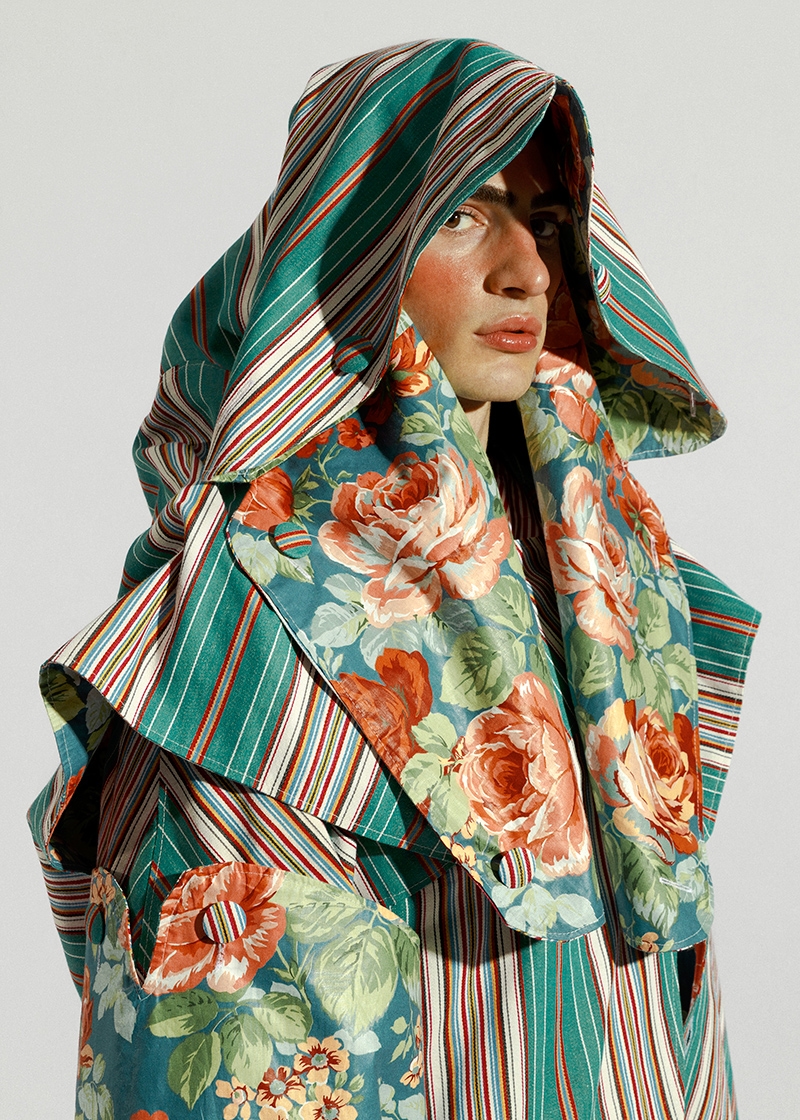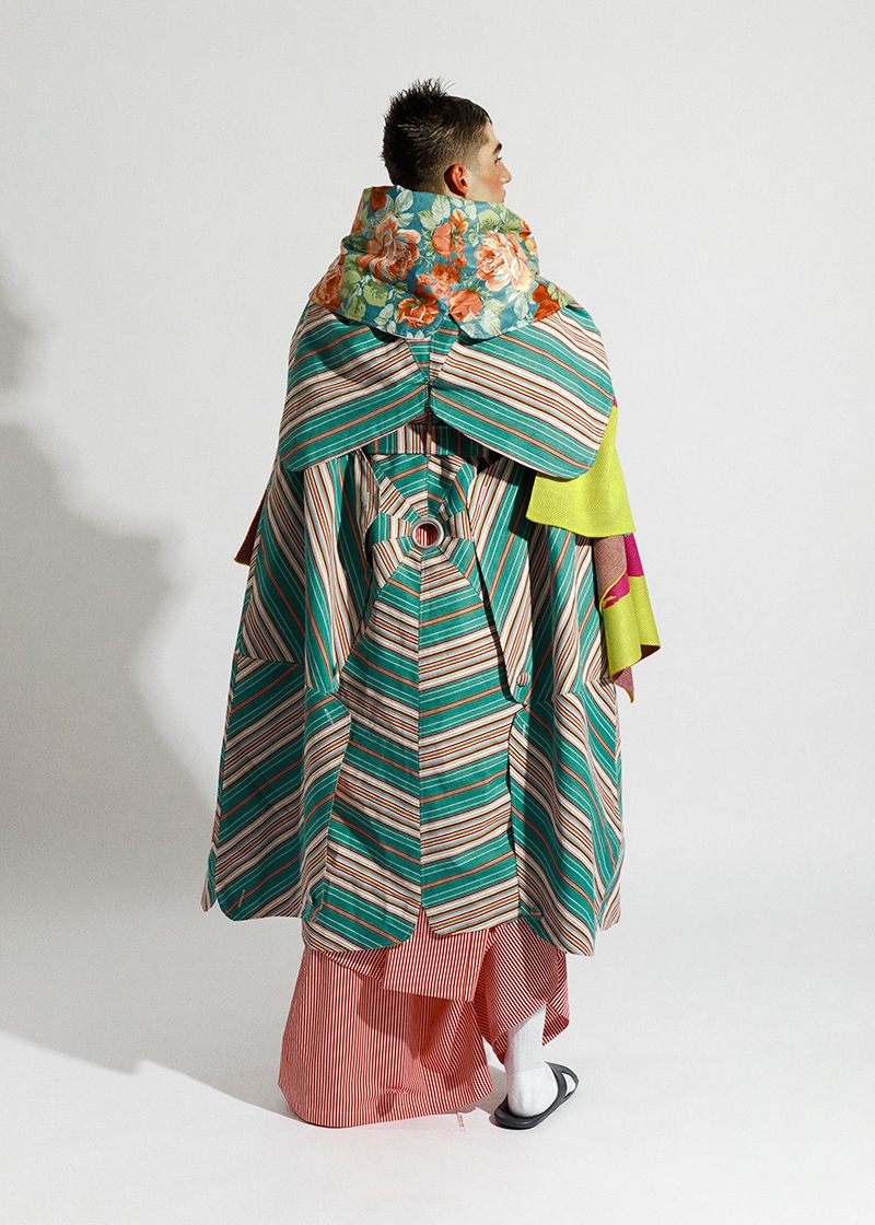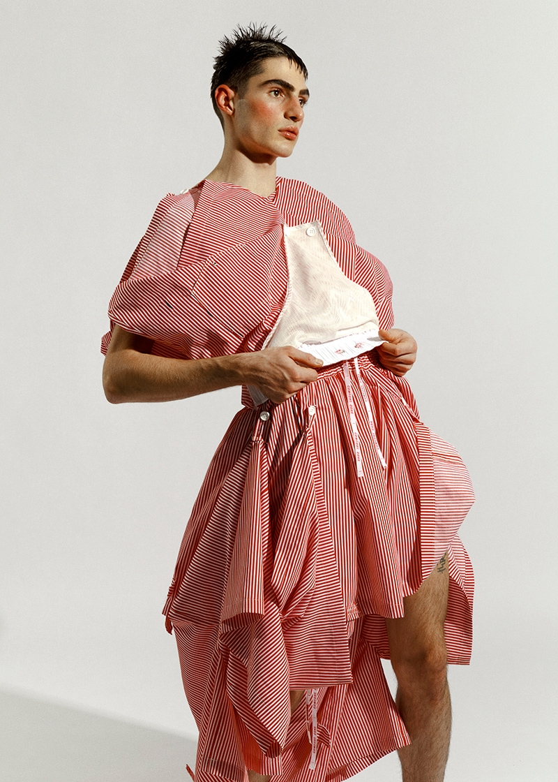 “Aitor Goicoechea Aburuza is a 20 years old Basque student at IED Barcelona. For his 3rd year, he presented a special project showing one look from his current collection, featuring model Alejandro Moya Alonso photographed by Celeste Galanda.