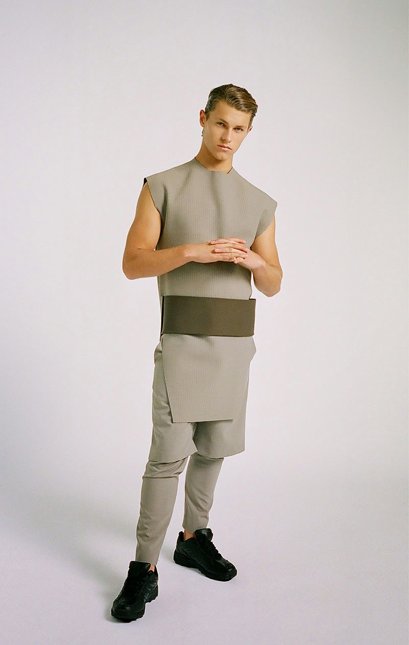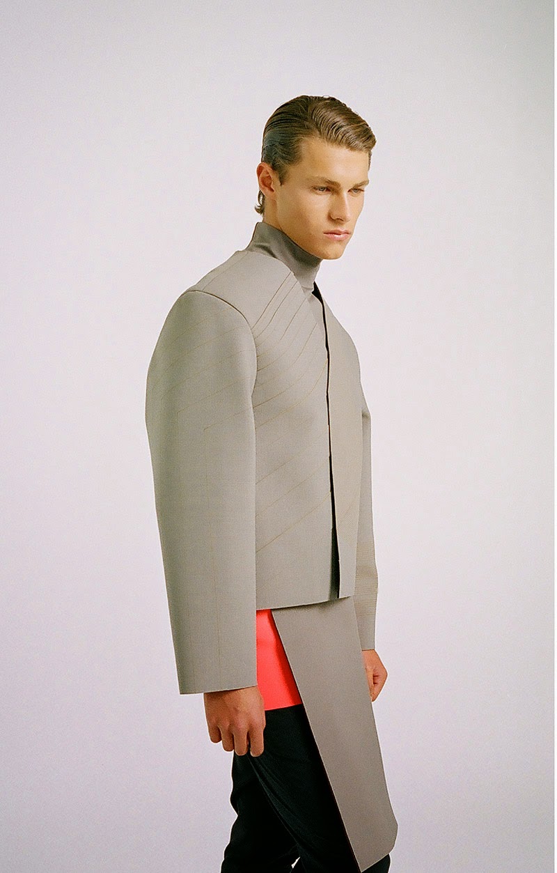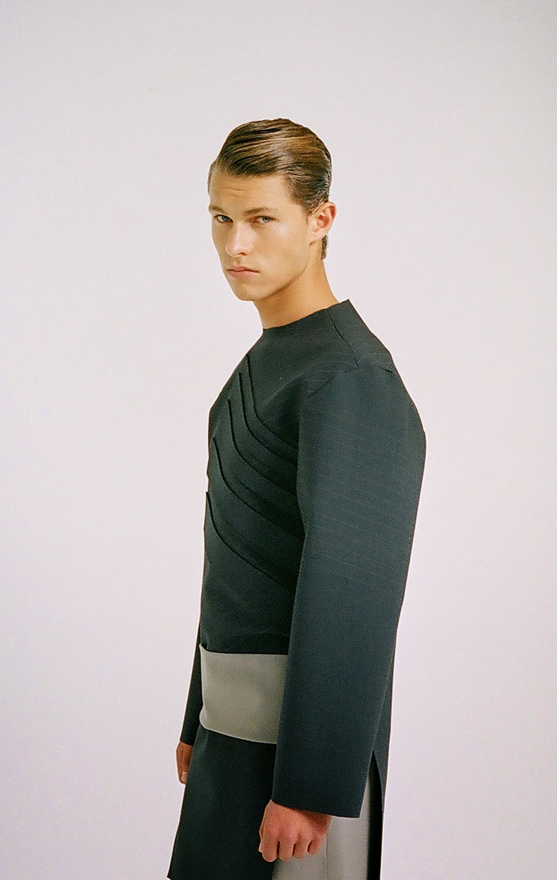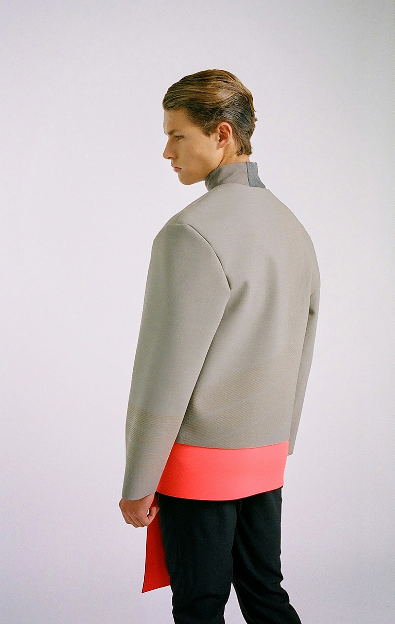 Donald Chung from the University of Technology (Sydney) presents his final graduate collection titled “RESIST & EXIST“. The collection is conceptually based around dress practice within North Korea. It is an enquiry into an isolated society that has not experienced modernity in the Western sense, and still relies heavily on propagandic representations of hypermasculinity, militarism and uniform. The sensibility is hard, precise and linear.