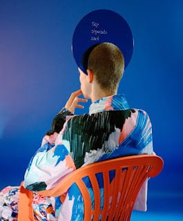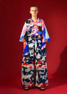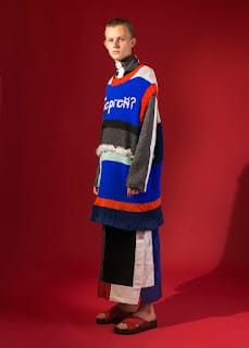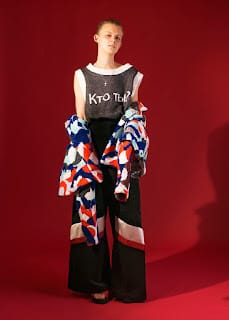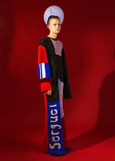 The flamboyance and saturated side of her collection evoke the iconic dimension of the character and appear in both, textile processing and color range. The fabric range is composed of traditional and natural fabrics, but also glossy plastics evoking sportswear. She also used velvet, which both recalls Russian interiors and modern tracksuits. The prints are crude and violent, but magnified by colors; This translates her vision of Russia. In parallel of the knitting work, she also created a very thick and colorful weaving in partnership with Malhia Kent, which gives the garment a cocoon appearance, to remind the idea of a dreamed character.