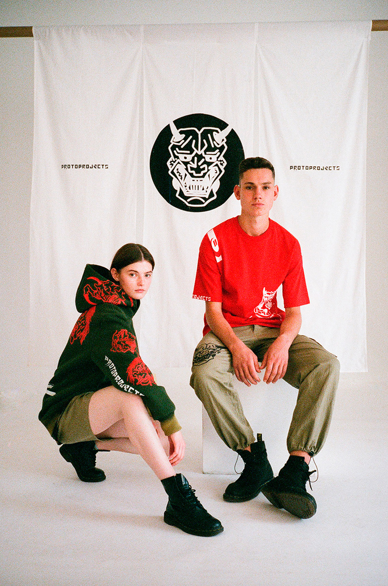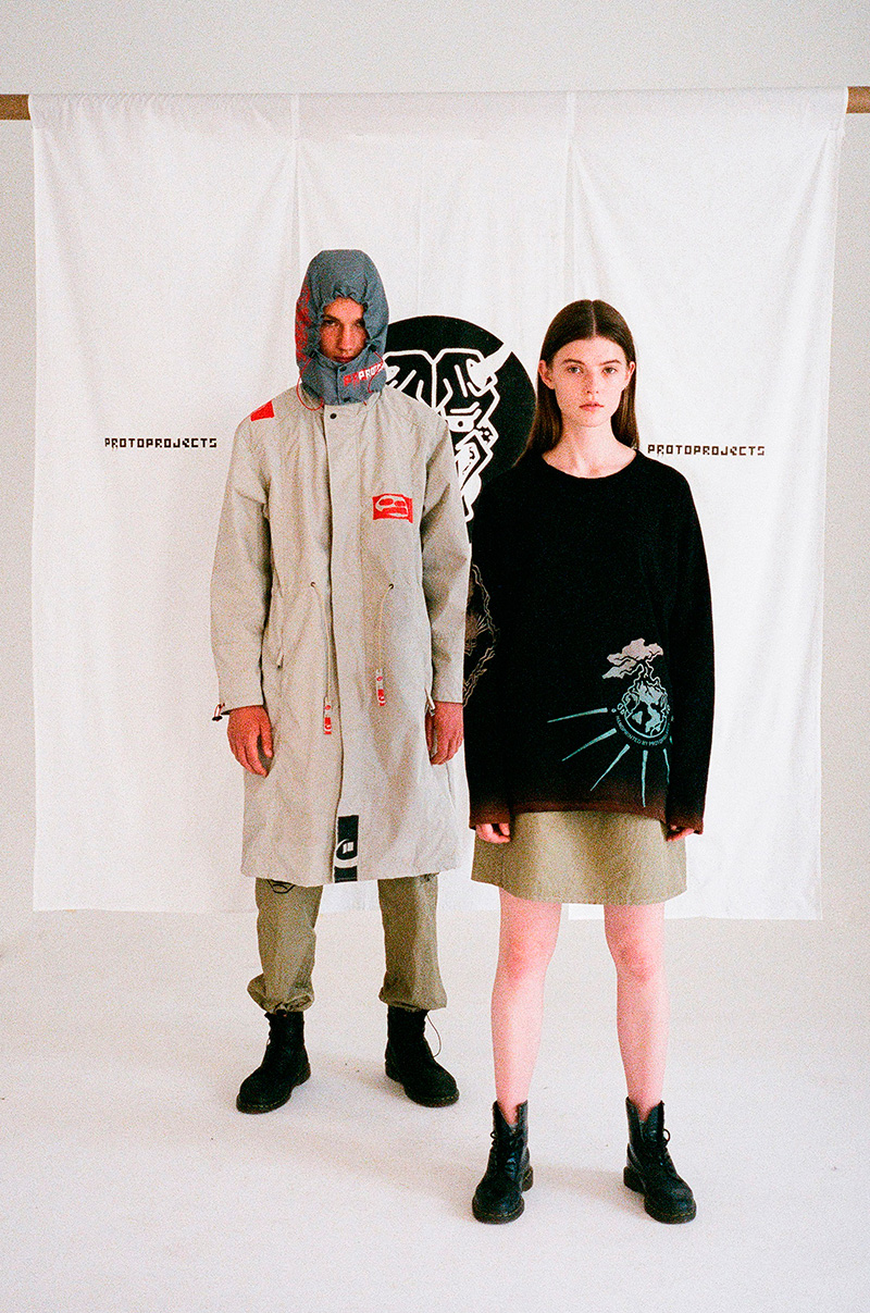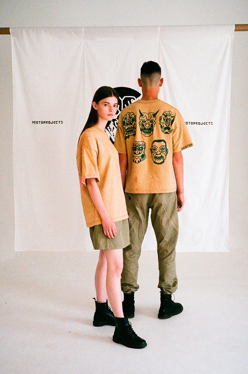 PROTO 1 debut garment series refers to Japanese mythology, using images of spirits, ghosts and other folklore creatures as a main part of design. Primary attention is given to craft techniques, such as hand-printing, hand-dyeing, and hand-discoloration. In some garments, thermochromic and photochromic inks are used, which creates an effect of print appearing from temperature or sunlight.