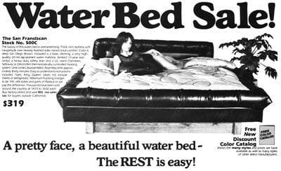 Waterbeds grew in popularity from the mid 1970’s thru the late 1980s. They became a symbol of the free spirit and sexual freedom that defined the era. By 1987 waterbeds account for 22% of all mattress sales in the US (or 1 in 5) and racked up $2 billion in sales (which would be $5 million in today’s dollars). Wowza!