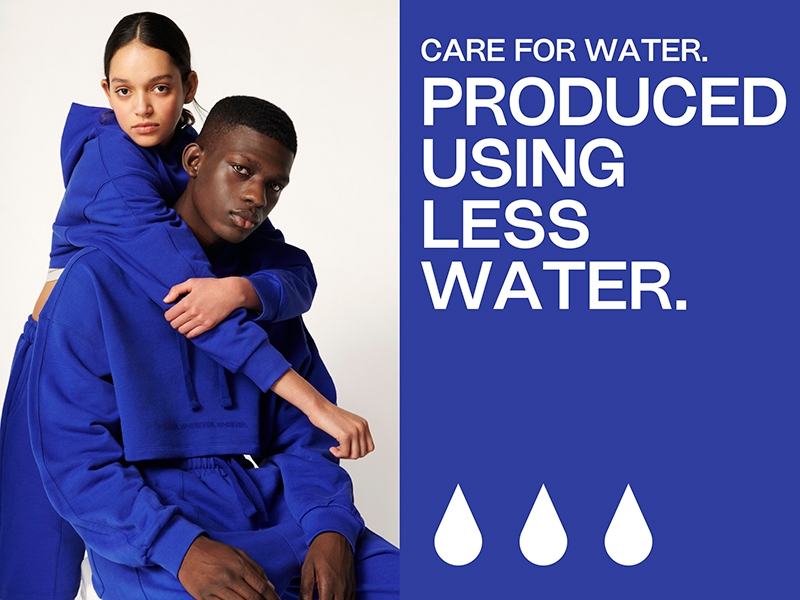 The CARE FOR WATER label has been emphasized by placing three minimalist water drops on the garments of the collection.