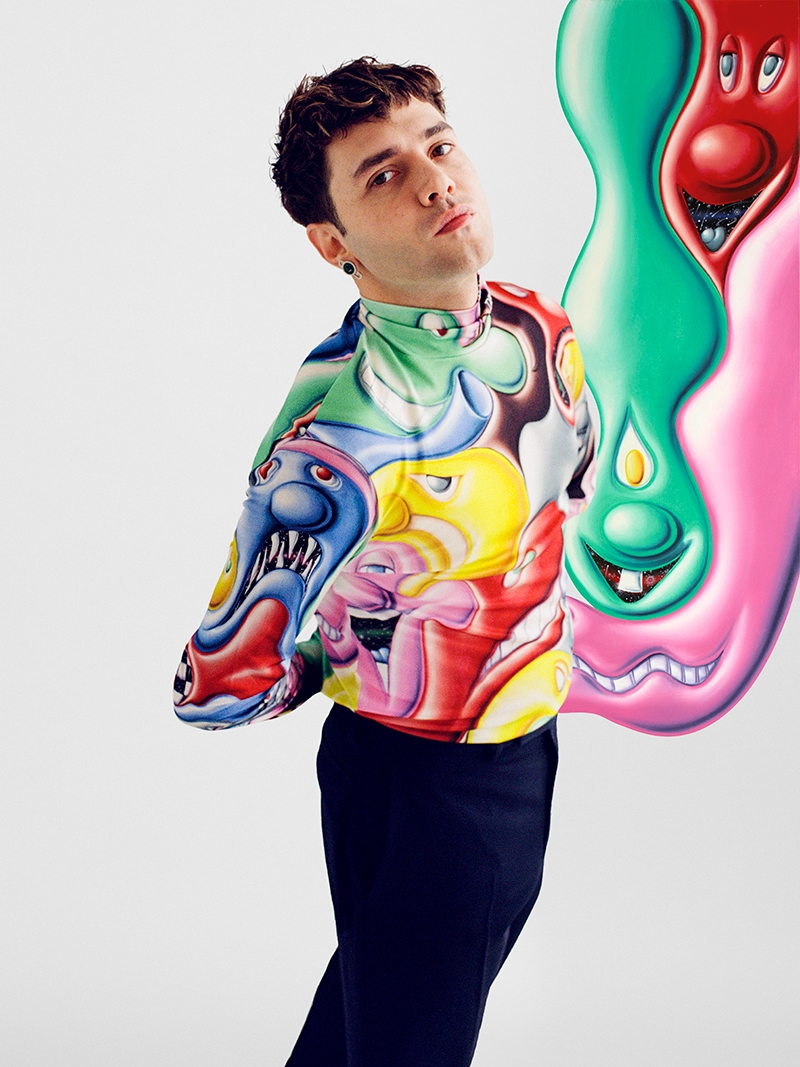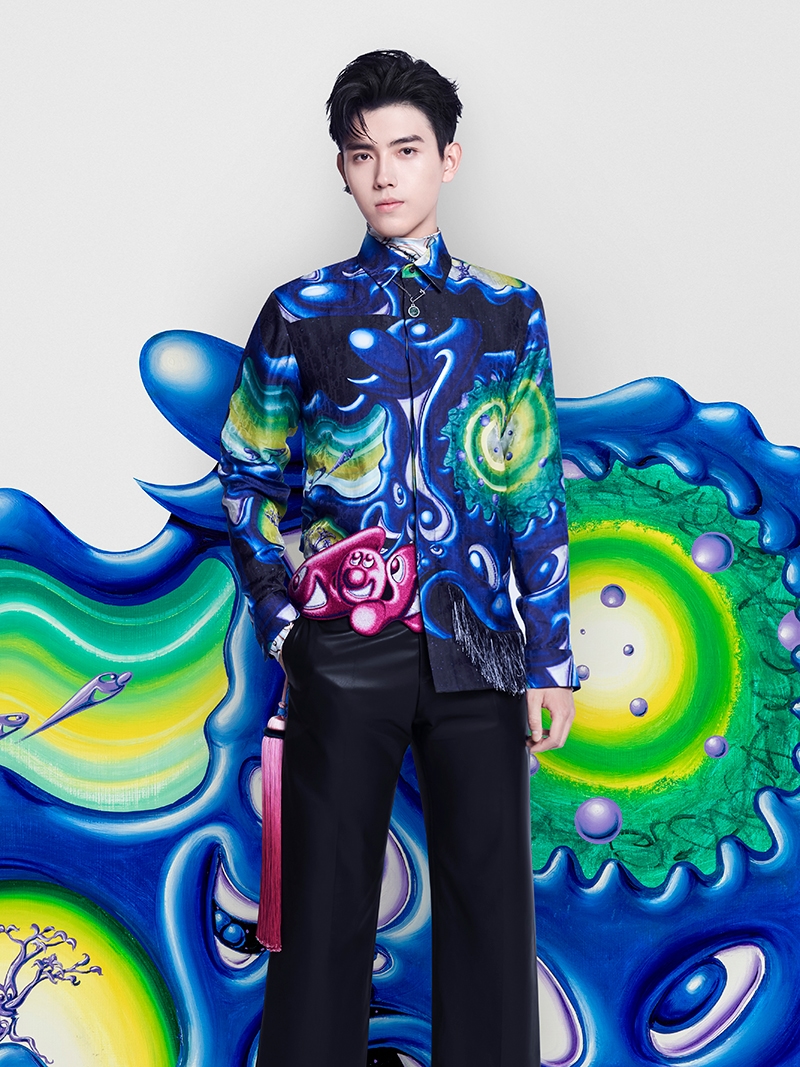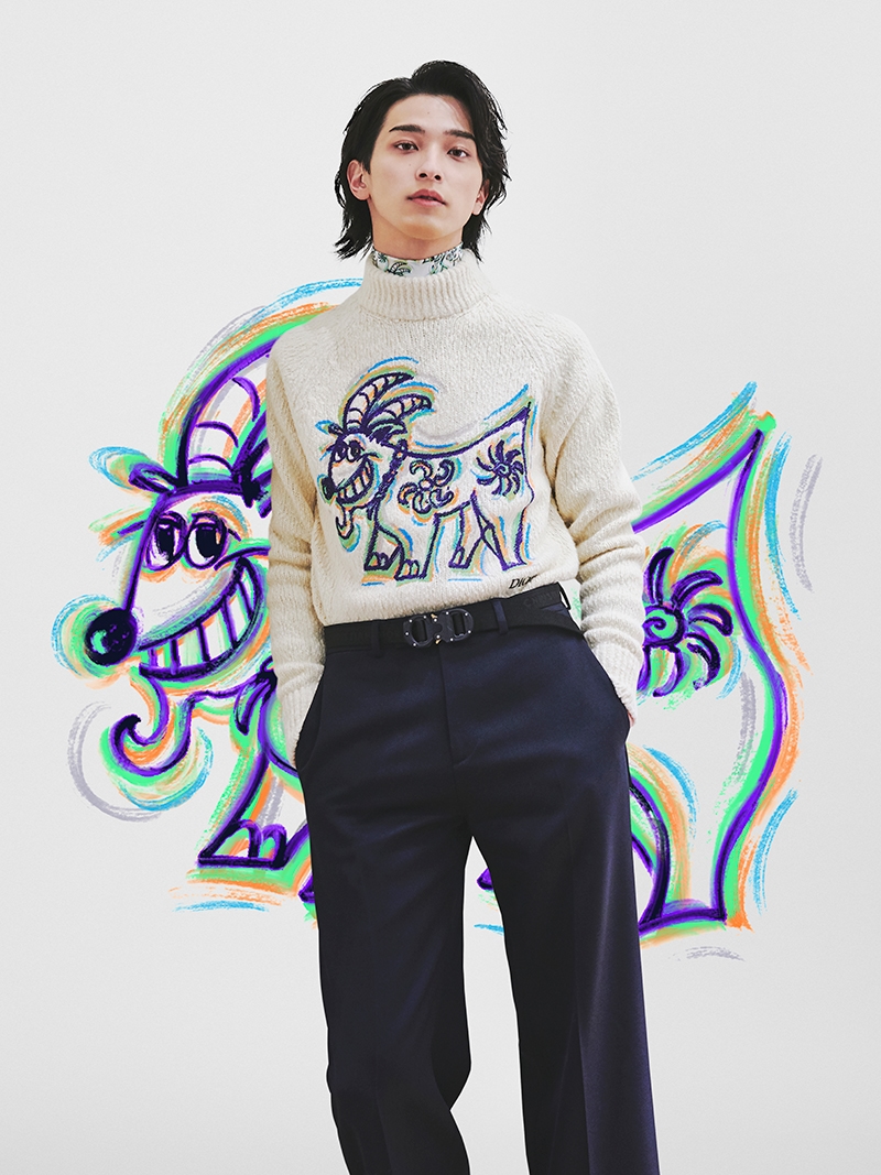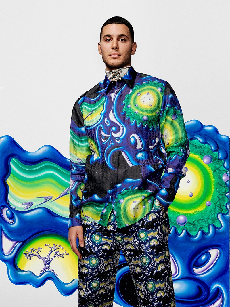 A philosophy that is reflected in the heart of each creation, informed by a revisited spirit of tailoring as well as Kenny Scharf’s* vibrant neon palette. Combining pop culture and science fiction, and inspired by cartoons and surrealism, the American artist, in collaboration with the artistic director of Dior Men’s collections, designed a series of prints and embroideries in bright hues brimming with joyful energy.