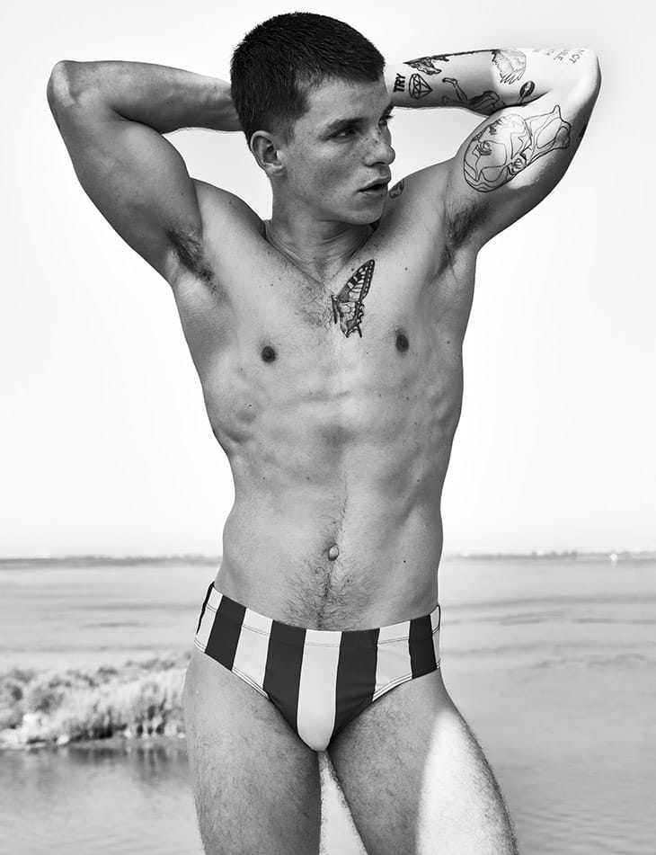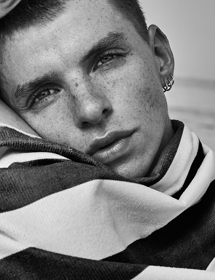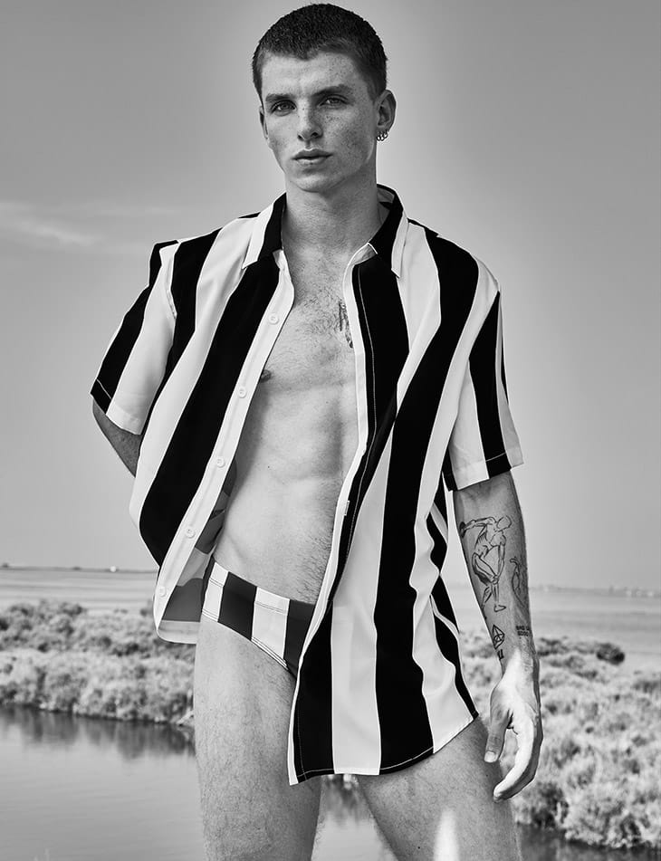 Threads: swimsuit, Levi’s shirt, Loewe hat, Diesel shorts, and towel by Marks & Spencer.