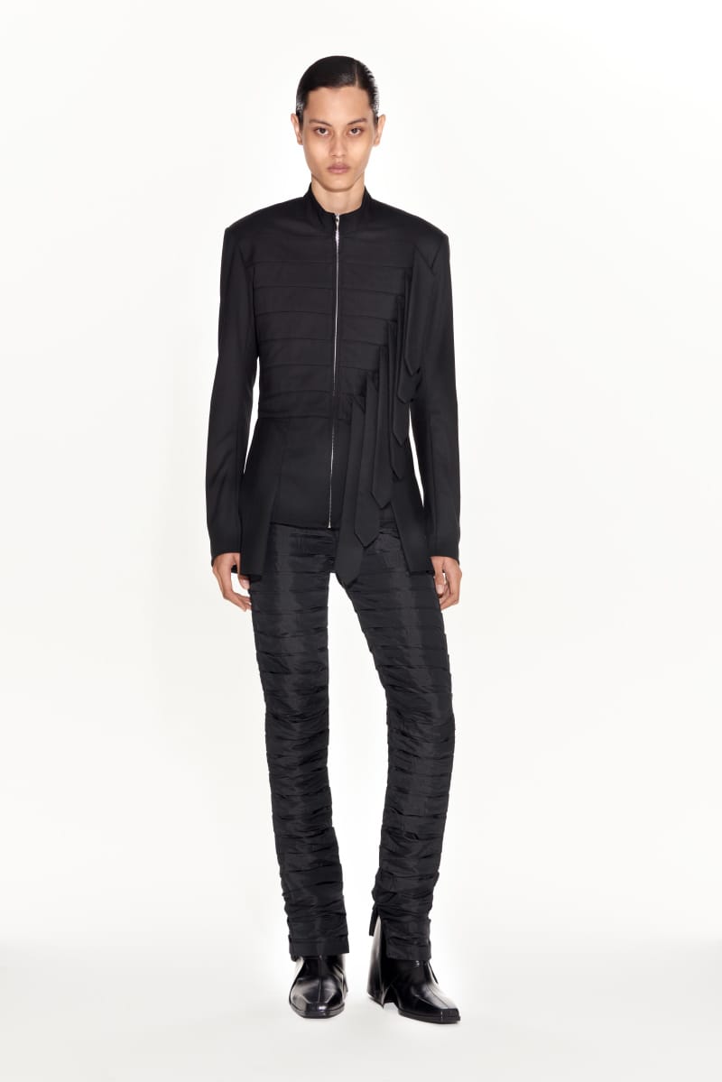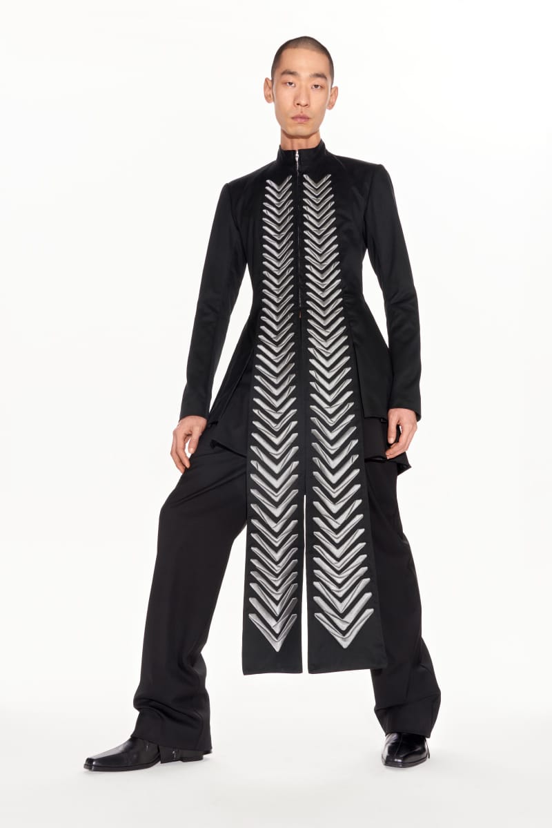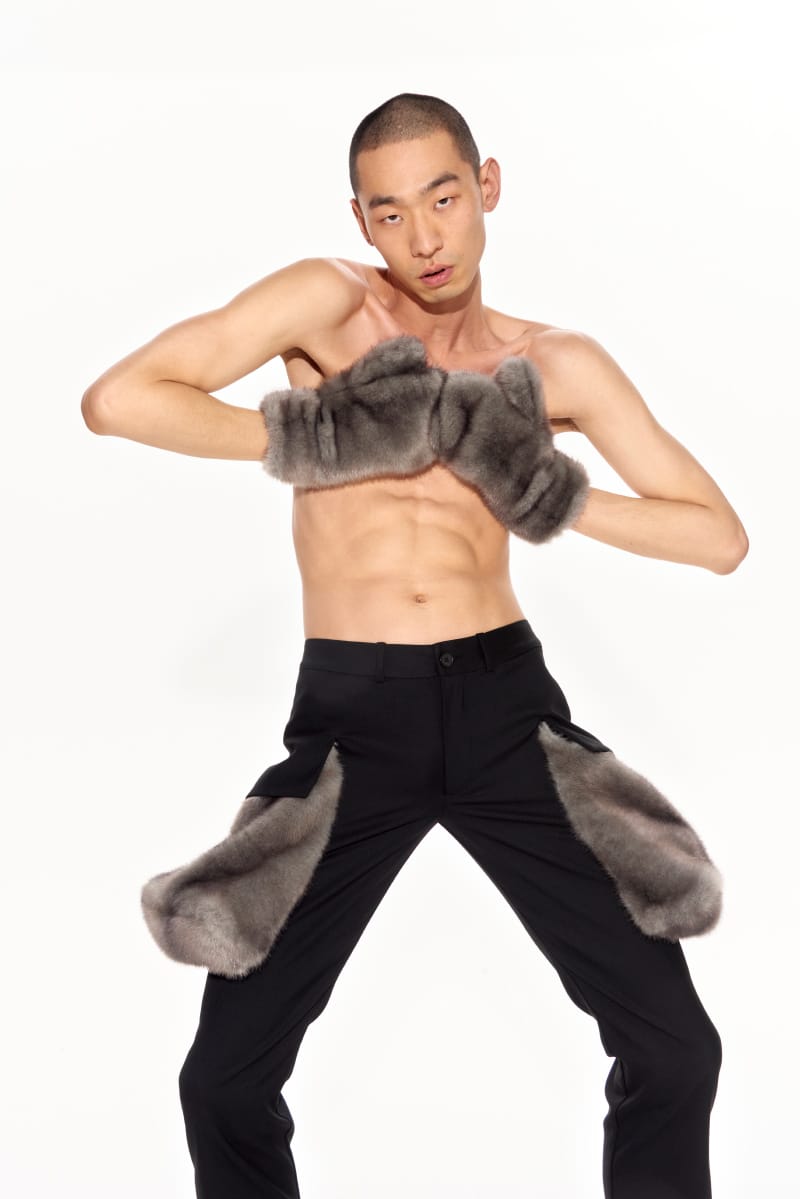 “GOOMHEO’s fifth collection, Goom challenged herself by stepping out of her comfort zone, using new materials juxtaposed with traditional couture techniques. Not only focusing on conventional menswear but more centered on creating a new character, rather than defining or dressing into a specific gender.”