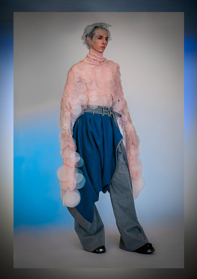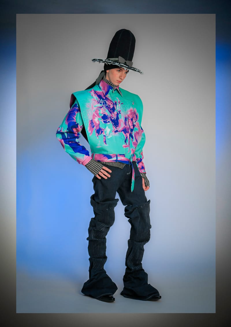 “This collection was born from the fusion of two diametrically opposed elements: the rigid masculinity of the South American cowboys – the gauchos – and the extravagance of the club kids and the generations that have followed them to this day. The gaucho, a mestizo by origin, is the perfect example of the fusion of European colonialism in indigenous lands, so much so that his wardrobe is a mixture of indigenous (Quechua) and European clothing. This ambiguity is the cornerstone of the collection. Thus, there are contrasting elements that are combined into one, such as the hybridisation of skirt and trousers in the «chiripas». The jewels of the Mapuche people (indigenous people of southern Chile) serve as inspiration and give shape to the dresses and accessories. Finally, the collection also aims to take a critical look at the toxic masculinity of «machos» in Latin America and to shake up the installed normativity.”