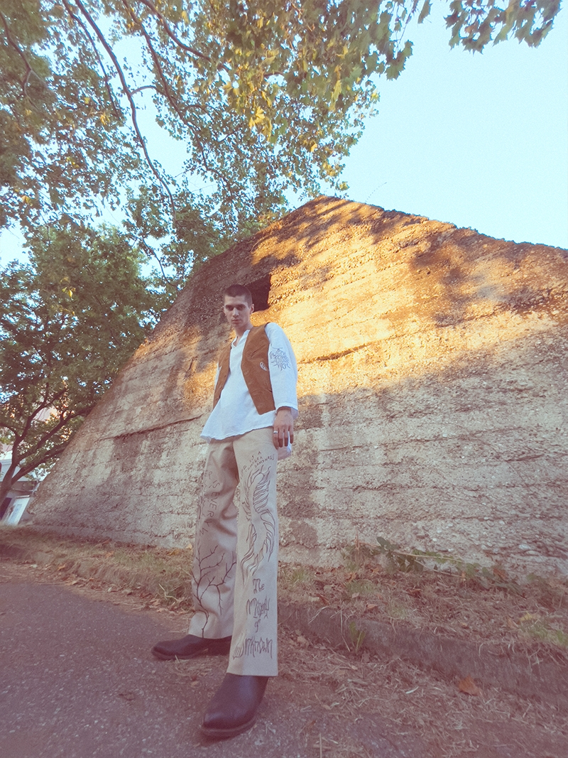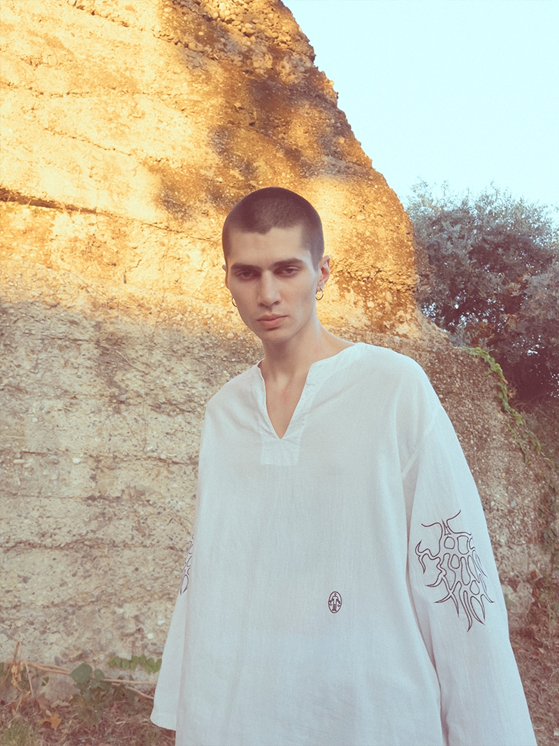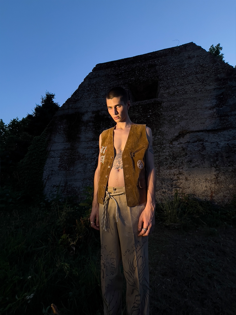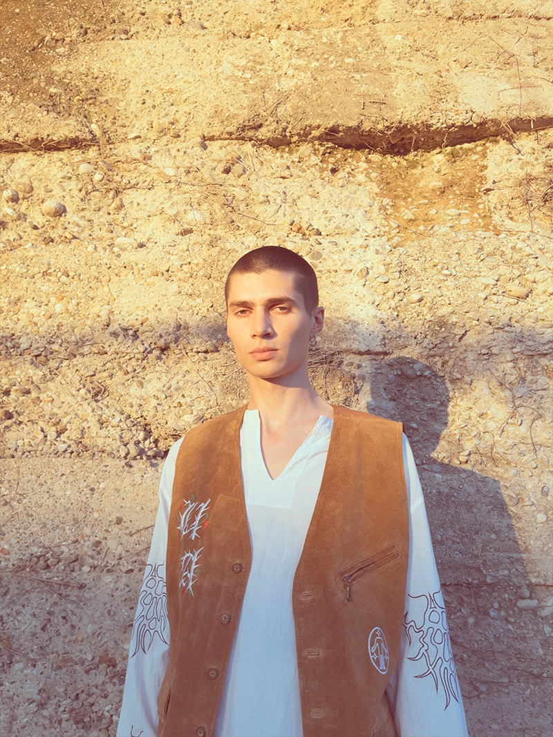The drop consists in a limited collection made up of handmade items produced using secondhand, vintage clothing and up-cycled fabrics, which he tailors and embellishes in his laboratory. Suede vests, linen shirts, hand tie-dyed and natural textures, cotton shirts and trousers embroidered with graphics inspired by anthropological motifs. An homage to a new and socially responsible fashion ecosystem that is environmentally conscious.