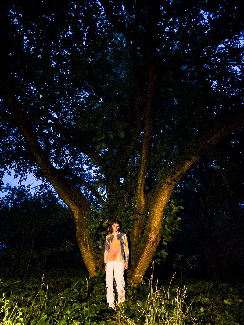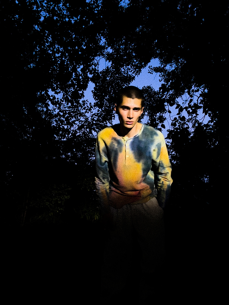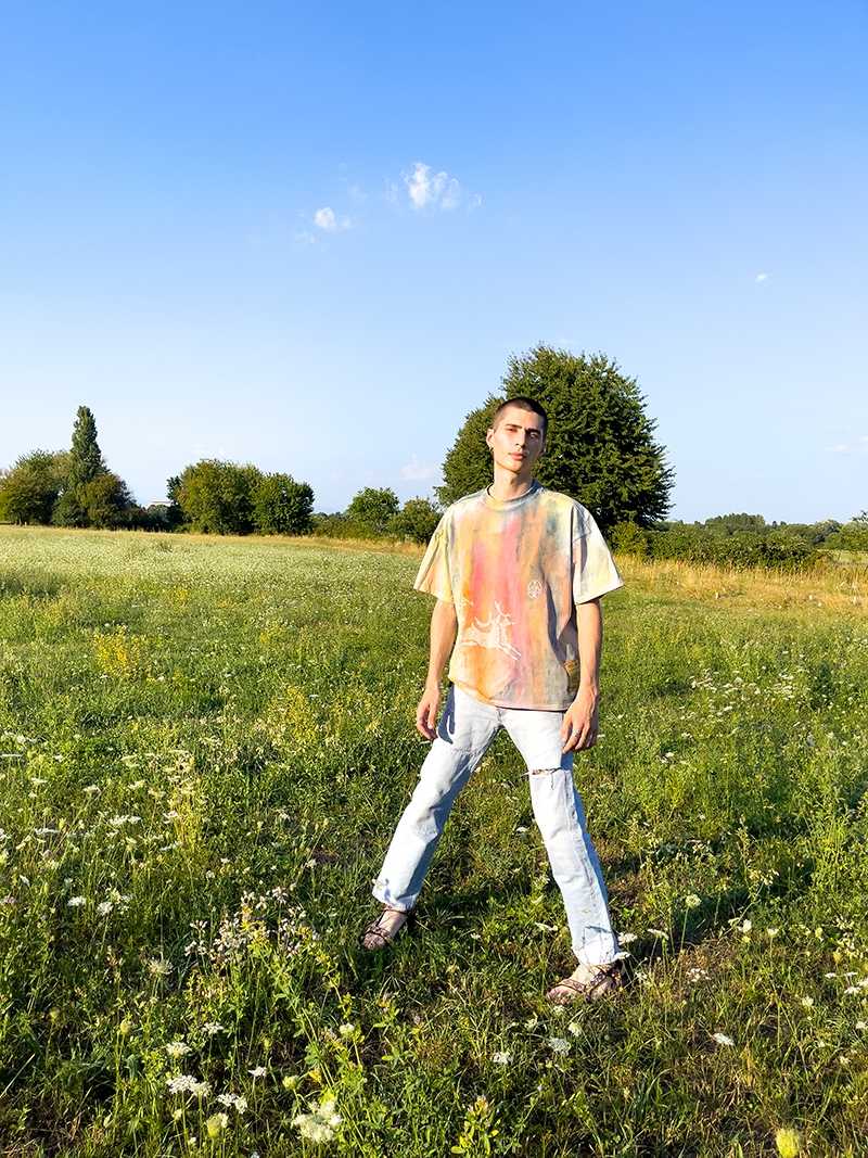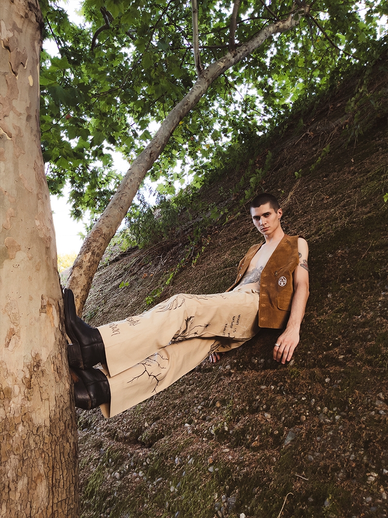 The drop consists in a limited collection made up of handmade items produced using secondhand, vintage clothing and up-cycled fabrics, which he tailors and embellishes in his laboratory. Suede vests, linen shirts, hand tie-dyed and natural textures, cotton shirts and trousers embroidered with graphics inspired by anthropological motifs. An homage to a new and socially responsible fashion ecosystem that is environmentally conscious.