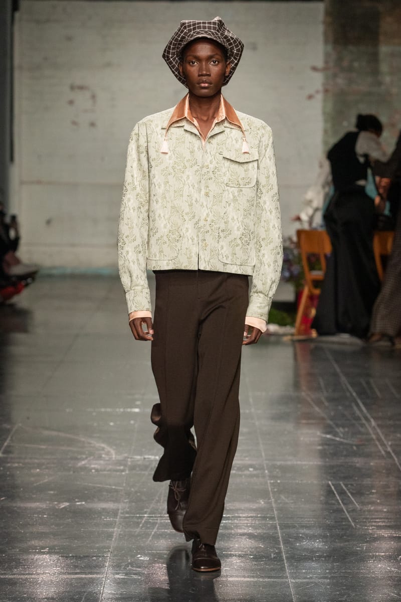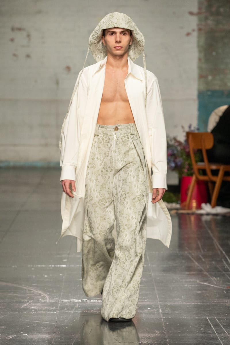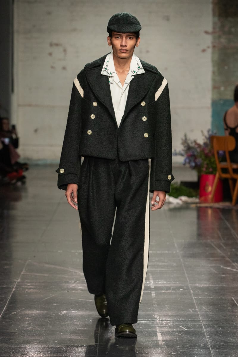 “As I worked on the collection, I started writing my own narrative. For each look, I gave it a character. It jumps from different periods and reference points, merging with my ideas of theatre and movement, to build my own modern-day period drama,” says Steven Stokey Daley.