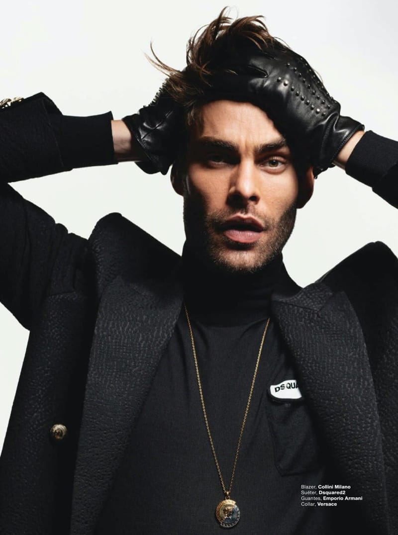 Stylists Ilaria Niccolini and Giorgio Ammirabile come together to serve up opulent looks for the feature. Front and center, Jon sports everything from studded leather gloves and a pendant necklace to elegant tailoring. He dons brands like Jil Sander, Dsquared2, and Versace. Meanwhile, Albi captures delicious images, using a rich contrast to highlight Jon’s sharp features.”