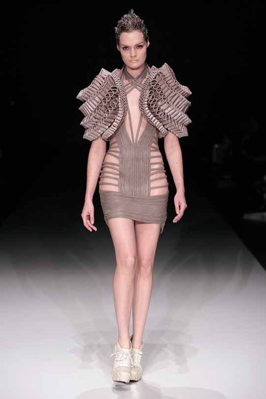 PARIS – ‘Mechanical Couture, an exhibition which opens next week at Israel’s Design Museum Holon, calls attention to the couture-tech courtship. So we thought it was time we caught up with Dutch designer Iris van Herpen, whose S/S 2011 collection includes a fossil-thin bolero made by what is essentially a 3D printer. From collaborations with Ecco leather, Rem D Koolhaas’ shoe line United Nude and choreographer Nanine Lenning, Iris manipulates materials into structural explorations that have brought weary showgoers to their feet. We tracked Iris to her Paris showroom to find out what it’s like to go hi-tech…and to demand an explanation for her absence from London Fashion Week last month, where the 26-year-old designer has been showing since her graduation from talent incubator Central Saint Martins.