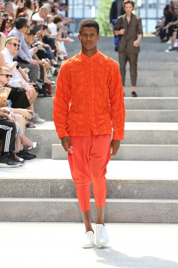 The European across the pond Mr Simons is not the only person fascinated by the trend, the creative director of Issey Miyake Men also ventured in the total-orange looks for the Spring Summer 2018 runway. The same daring response came on the runways of fashion designer Boris Bidjan Saberi (read our exclusive interview with Bidjan), whose followers are known as a total-black army throughout the industry. Till the Paris runways, a Bidjan look was defined as a total black look, yet orange in his new collection is a moment to reflect on.
