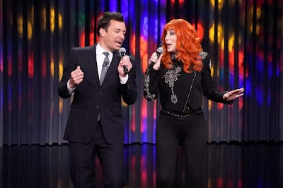 Cher also gamely took part in Fallon’s ongoing segment “Lip Sync Karaoke,” in which the two lip synced to her song “Believe” — with a twist. Instead of Cher’s vocals playing in the background, they had random karaoke singers in New York sing their version of her song.” – hollywoodreporter.com