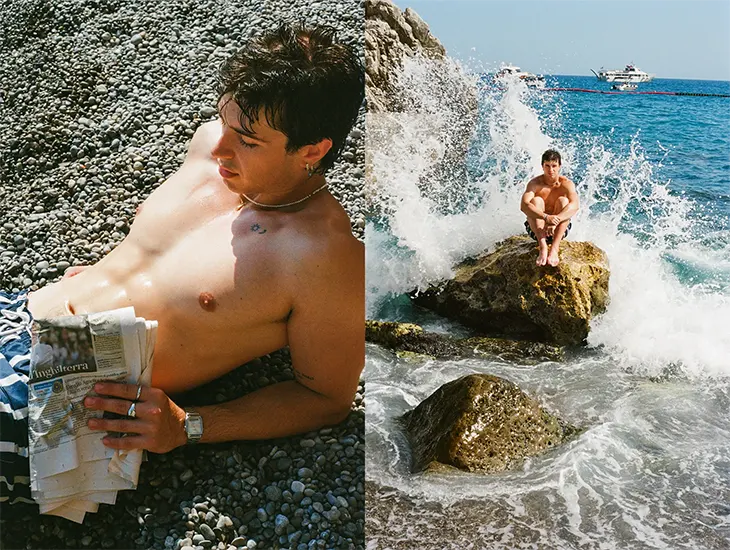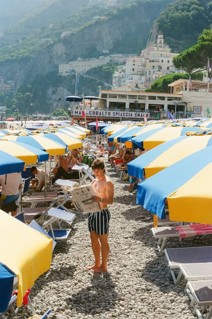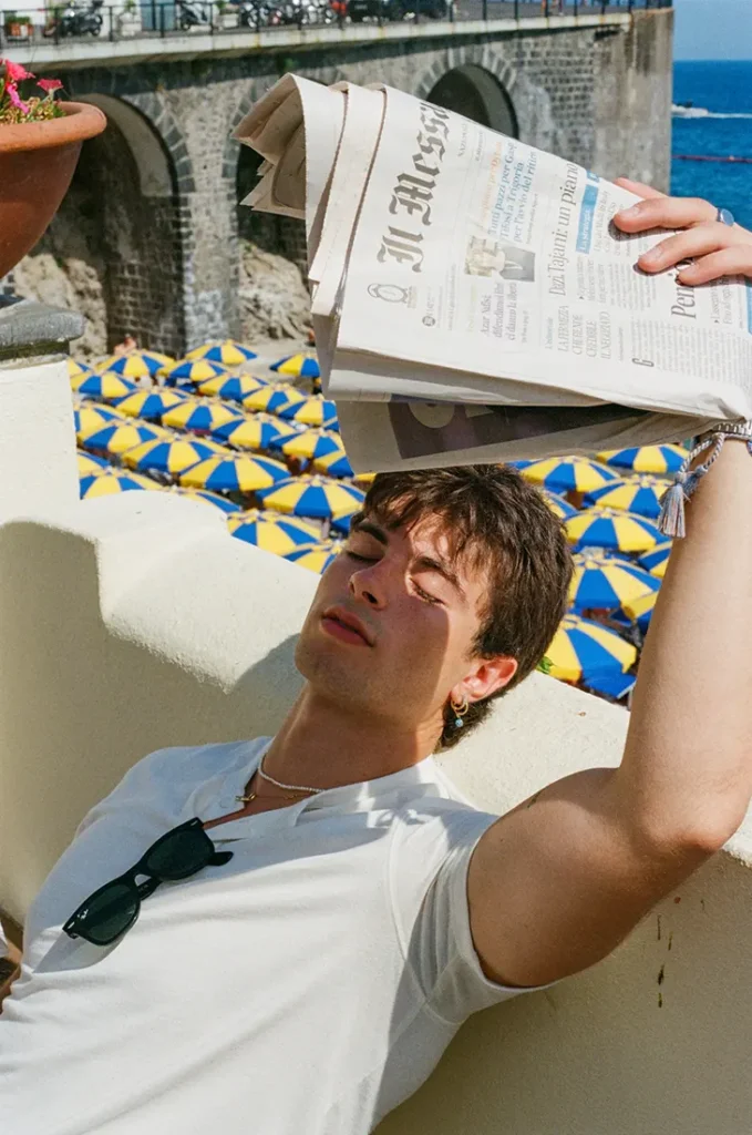 Shot on evocative 35 mm film, the editorial unfolds across the sun-soaked landscapes of Naples and Amalfi, grounding every frame in cinematic romance.