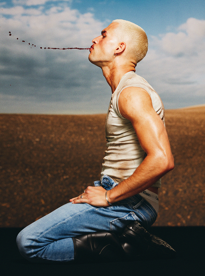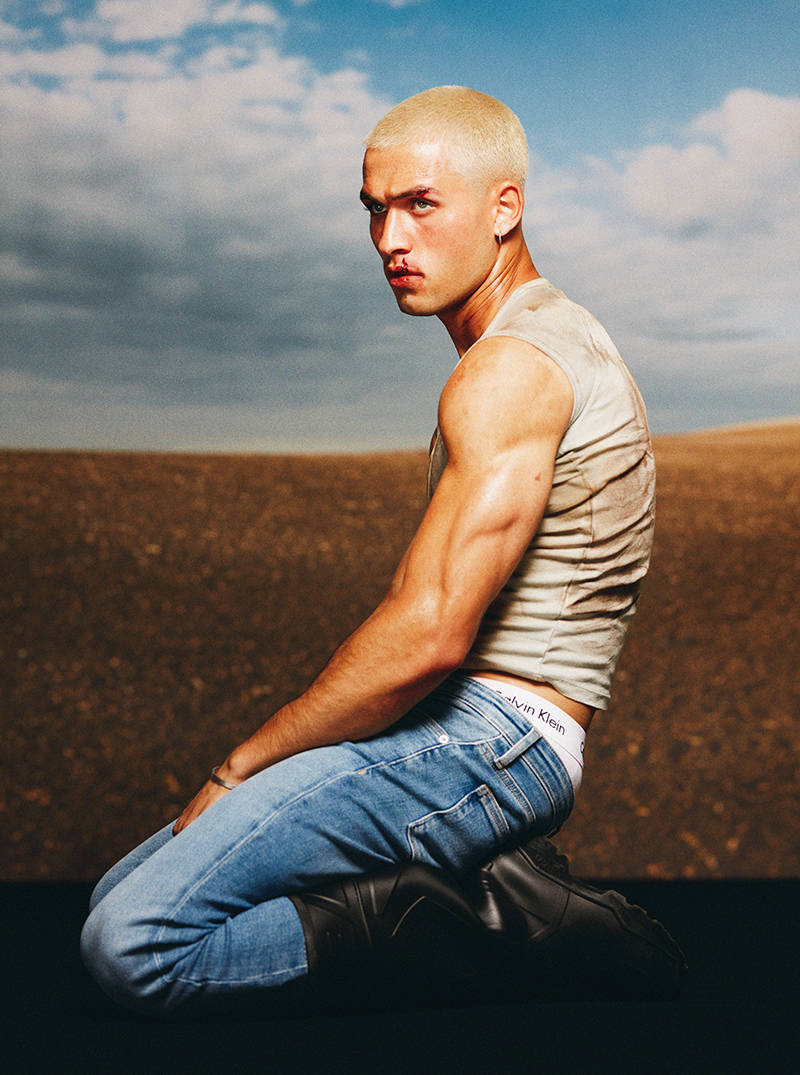 The shoot channels a grungy but dangerously beautiful aesthetic that highlights Lucas’s natural prominence and editorial versatility.