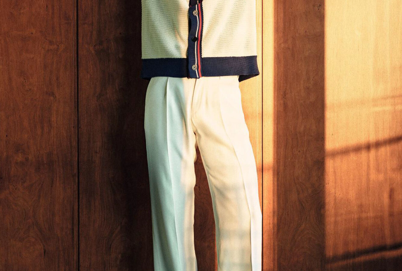 Man in a cream cardigan with navy trim and light mint trousers poses with arms behind head against a wooden wall, wearing mesh shoes.