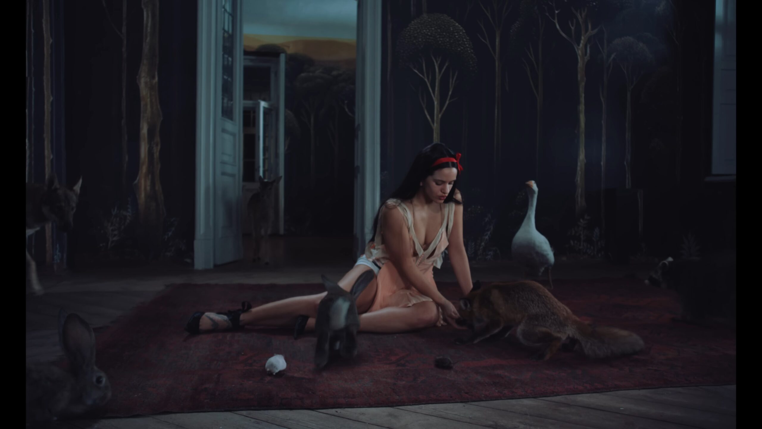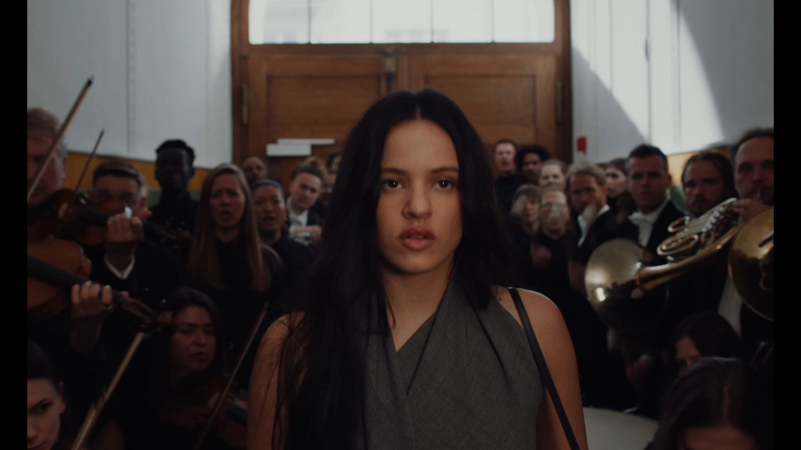 The video, directed by Nicolás Méndez, is a surreal spectacle—ROSALÍA ironing at home, riding the bus, and shopping, all while accompanied by a full orchestra. It’s eerie, eccentric, and exquisitely edited, with nods to Snow White nightmares and transformational reinvention.