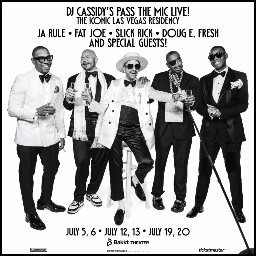 “Just as Frank Sinatra, Dean Martin, Sammy Davis Jr., Peter Lawford, and Joey Bishop united in Las Vegas to form the Rat Pack, one of the greatest shows of all time, Ja Rule, Fat Joe, Slick Rick, Doug E. Fresh, and I will unite to create an experience that will go down in Las Vegas history,” said Cassidy in a statement. “In the great tradition of Liberace, Elvis Presley, Wayne Newton, and Siegfried & Roy, we will redefine showmanship in ways The Strip hasn’t witnessed since the days of The Sands and The International. Every night will be a unique one time only event, black tie (optional) of course.”