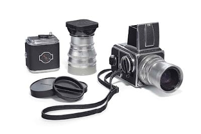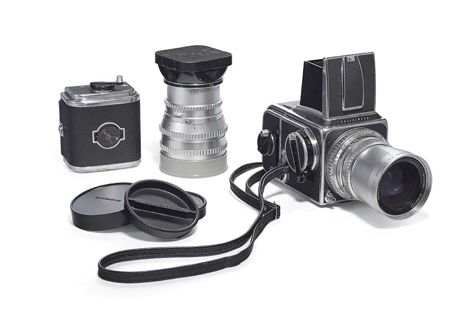 The Hasselblad camera, Carl Zeiss lenses and magazine backs included in the auction lot.
