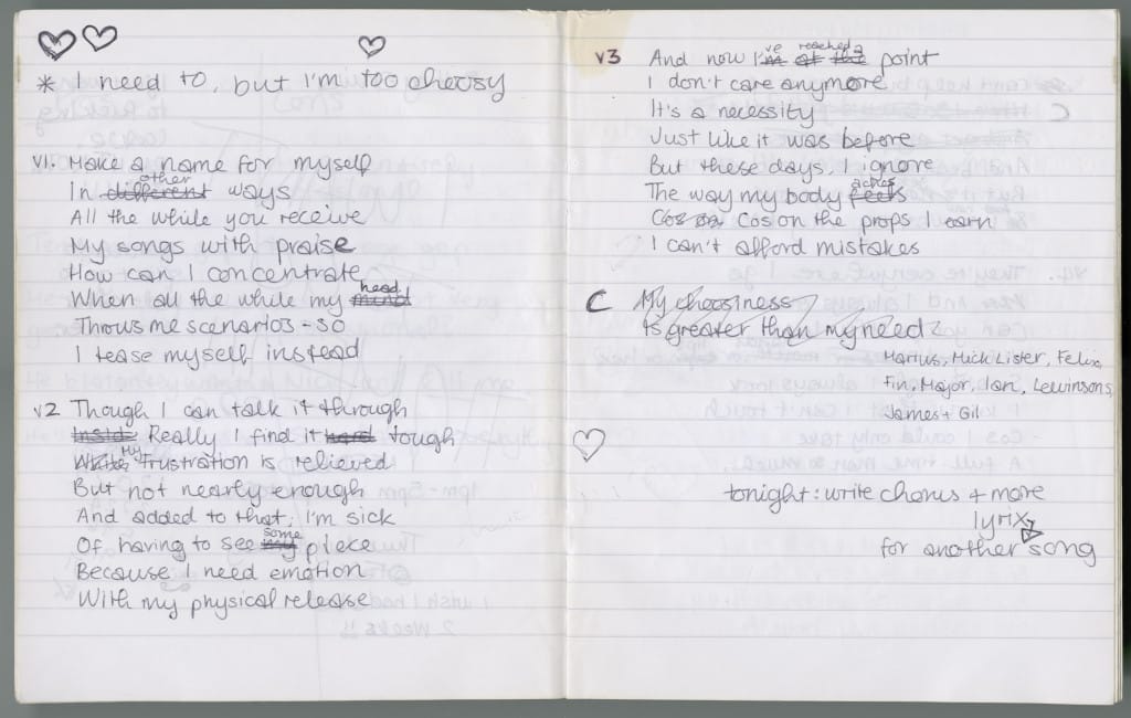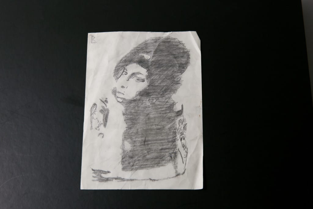 The exhibit also houses lyrics for songs both released (“Cherry”) and unreleased (“Dolly’s Diner”) as well as a self-portrait Winehouse drew.