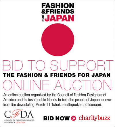 “CFDA Launches Online Auction for Japan Relief: Head to charitybuzz.com today to bid on meet and greets with Anna Wintour, an internship at Elle, a one week stay at Diane von Furstenberg’s home in the Bahama’s, and more amazing things as part of CFDA’s “Fashion & Friends for Japan.” – via cfda.com