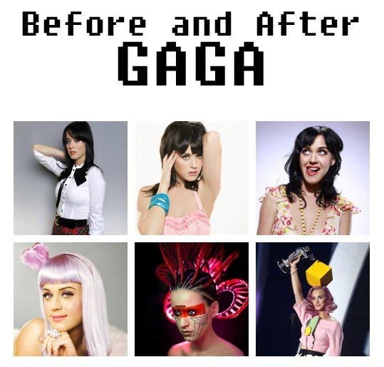 Photobucket “Pop Stars Before and After Gaga: The Gaga effect on pop stars of our time: they all dye their hair and start wearing crazy shit.” – Fashionista.com – via buzzfeed.com