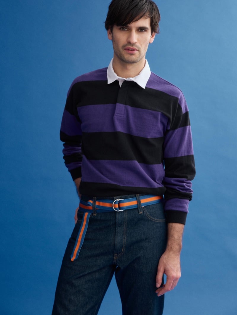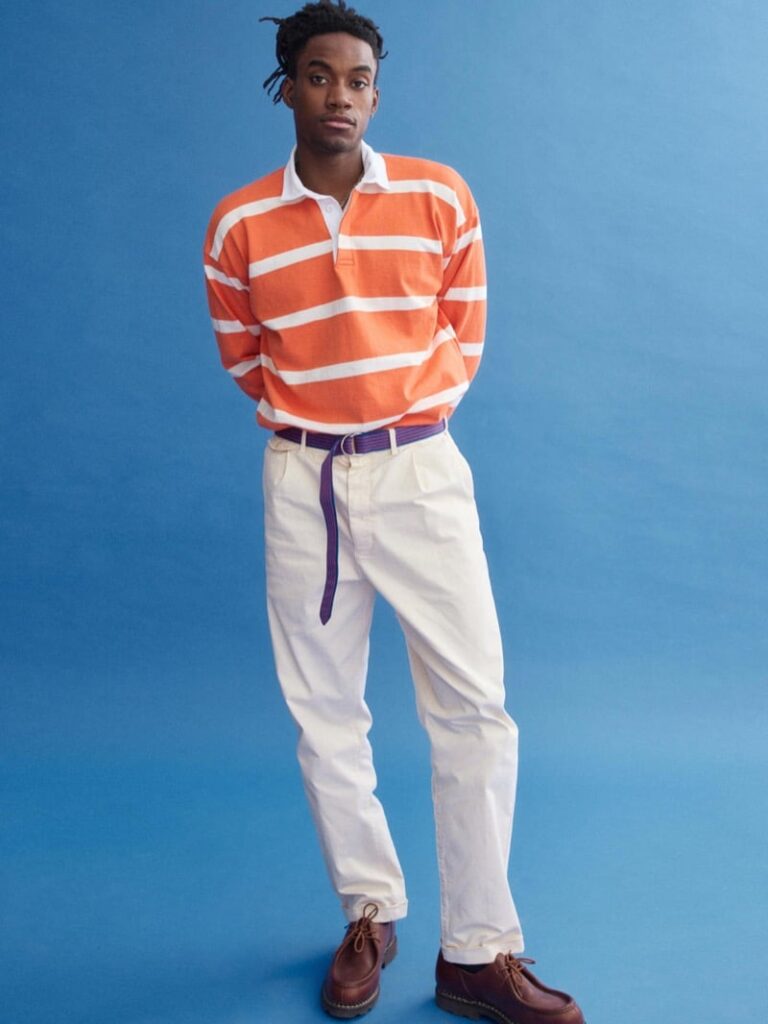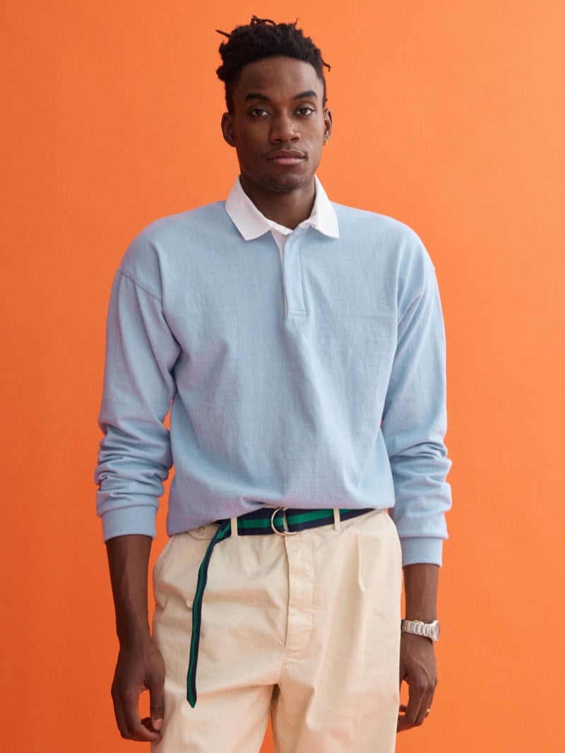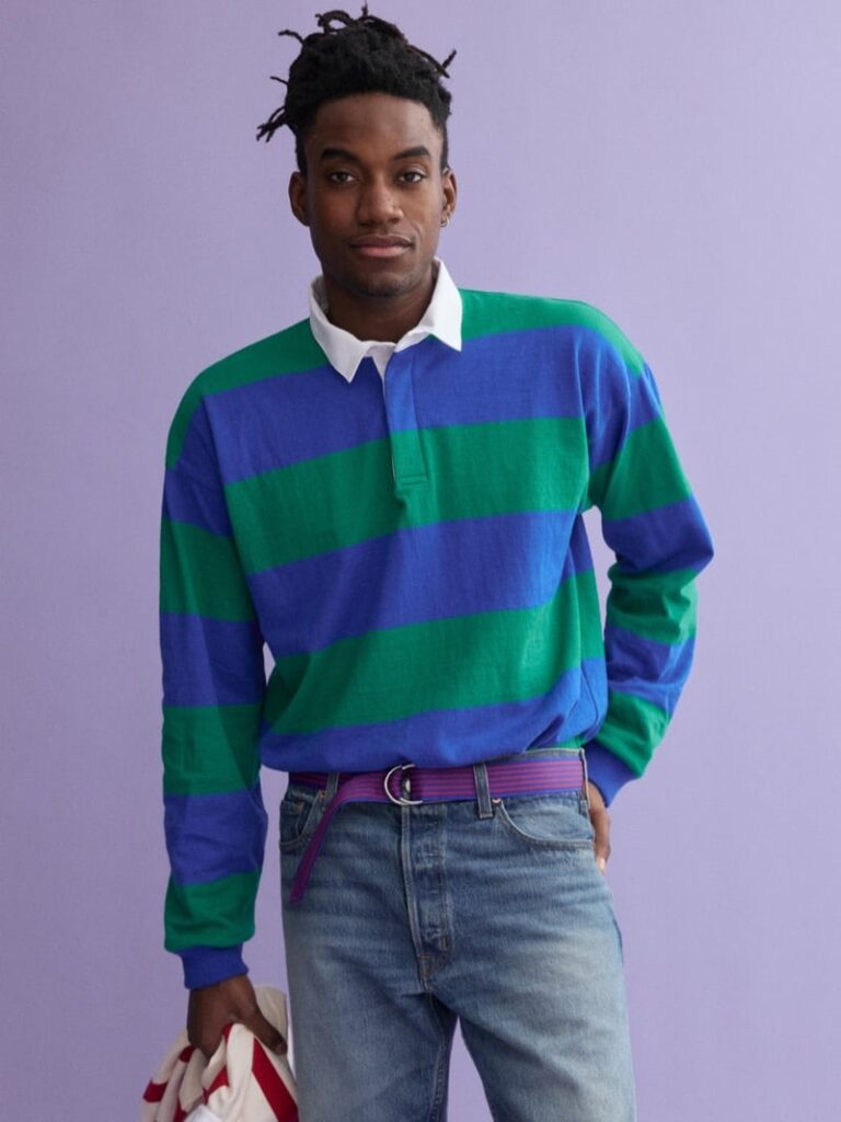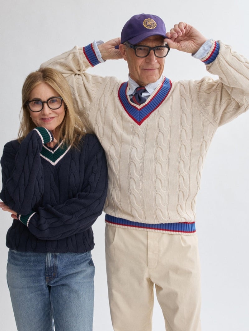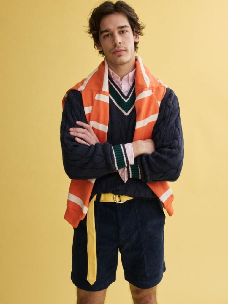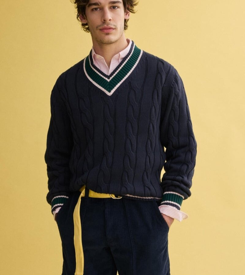 The collection taps into that American campus classic energy both brands do so well: crisp, collegiate, heritage‑coded, but with a wink of modern ease. And leading the charge is cutie patootie model Klevi Rybak, strutting in a navy cable‑knit cricket sweater embellished with fresh green trimming — the kind of piece that makes you want to grab a tennis racket, a textbook, and a lemonade all at once.
