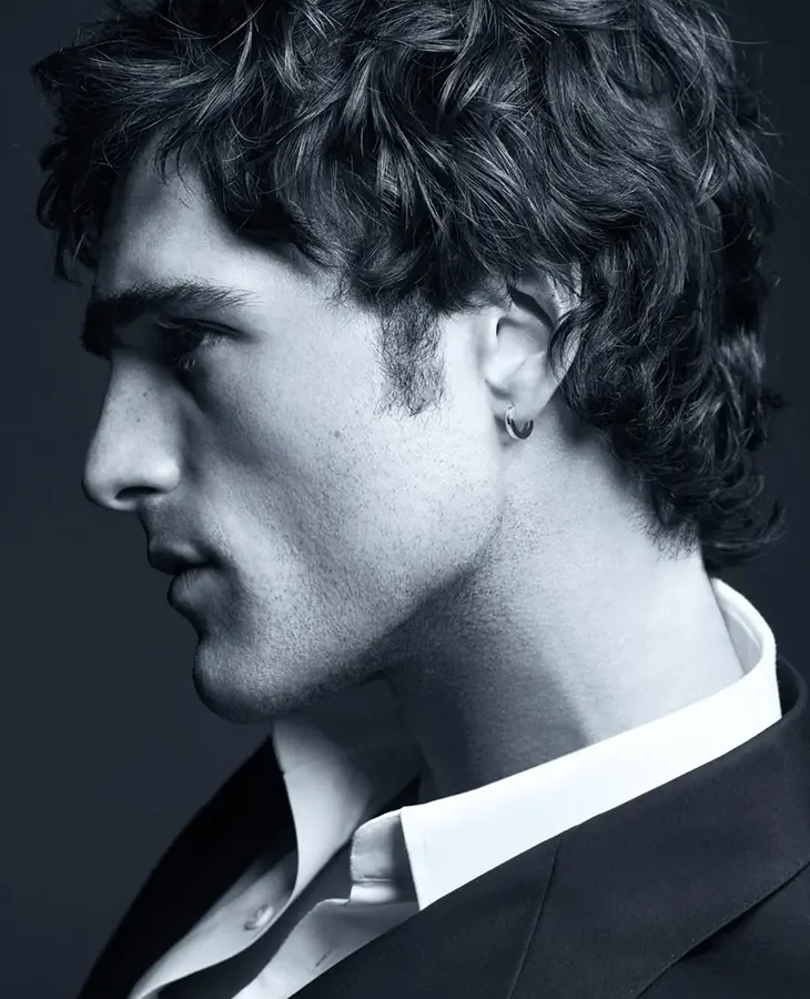Side profile of a young man in a suit, wearing a hoop earring, in a moody black-and-white portrait. Side profile of a young man in a suit, wearing a hoop earring, in a moody black-and-white portrait.