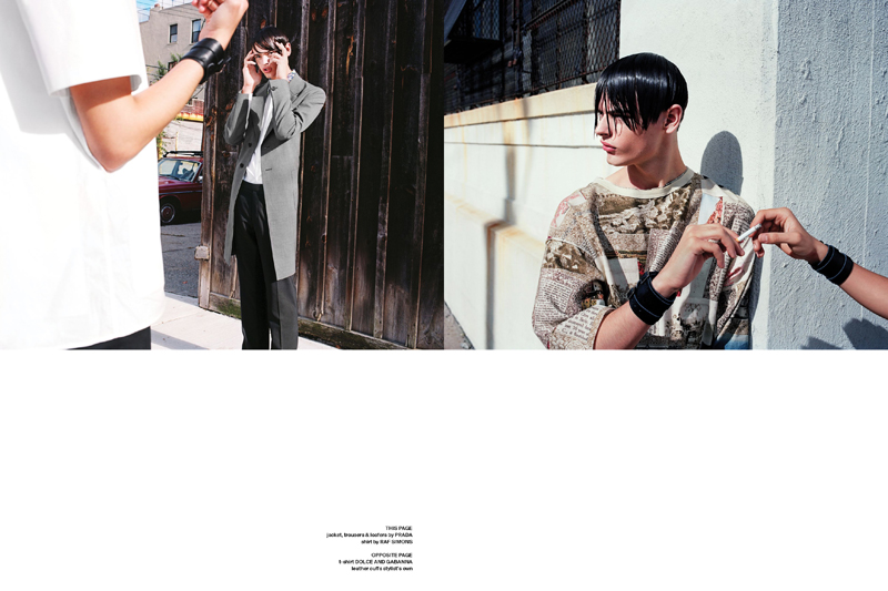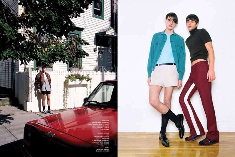 The Boys–Jacob Morton joins new face Matthew Logos for a story in Novembre photographed by Brett Lloyd. Hitting the neighborhood in eclectic fashions from the likes of Prada and Burberry, the cheeky pairing are styled by Tom Guinness. / Makeup by Javier Romero (Top 5 Management) and Ronnie Peterson (Artists by Next). Hair by Tamas Tuzes (L’Atelier) and Tim Nolam (Tommy Guns). Production by Heather Fitzgerald (Clyde Creative). Set design by Alex Clow. Photo assistance by Julia Wagner and Pablo Tapia Pla. Style assistance by Marcela Jacobina. Courtesy of http://thefashionisto.com