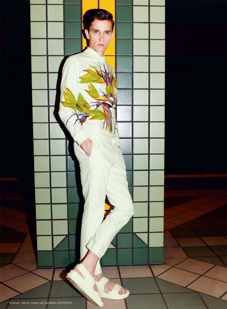 Color Me–Prints are all the rage as stylists Markus Ebner and Winnie Placzko come together for a new story in Achtung magazine. Pulling together solid looks from Givenchy, Kenzo, Versace and other notable labels, the chic pairing work alongside photographer Thomas Lohr to capture models Jakob Wiechmann and Peter Bruder. Courtesy of – thefashionisto.com