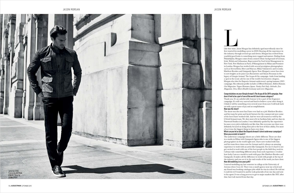 “Top model Jason Morgan teams up with photographer Goncalo Claro and fashion stylist Giorgio Ammirabile for Perfect Cut story coming from the pages of August Man Malaysia‘s September 2015 issue. Grooming is courtesy of Rossano Gualtieri. For the session Jason was styled in pieces from brands such as Armani, Versace, Bottega Veneta, Salvatore Ferragamo, and Zegna among other.” – Malemodelscene.net